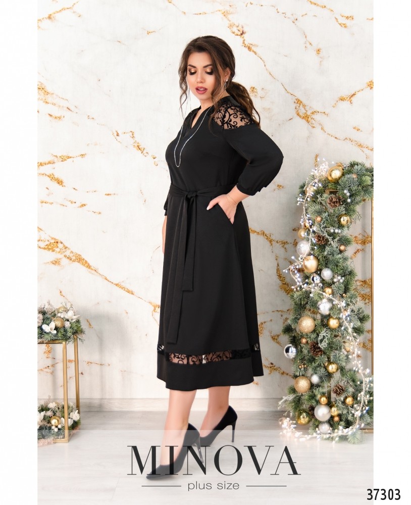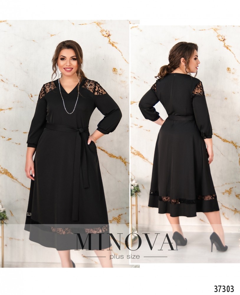 Приталенное нарядное платье батал с расклешённым подолом украшено кружевом на плечах и на подоле. Рукава с мягкими манжетами с одной маленькой пуговицей. На груди вытачки, по бокам – прорезные карманы. Вырез горловины V-образный, неглубокий. В комплекте пояс. Застёгивается на вшитую по спинке змейку. Пояс/аксессуар входит в комплект.