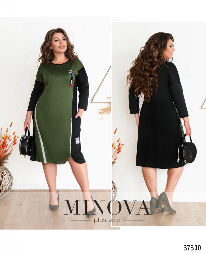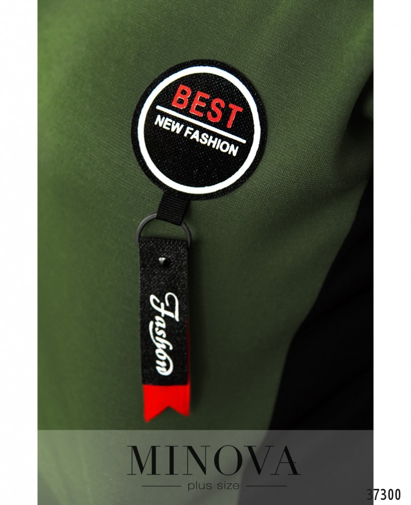 Повседневное яркое платье батал спортивного стиля, ткань мягкая. Застёжек нет. Рукава без манжет, контрастные. На груди – декоративная нашивка с ярлычком. Сбоку справа на подоле – декоративная блестящая лента, слева – рабочая молния и декоративная нашивка с принтом. По бокам – прорезные карманы. Спинка однотонная.