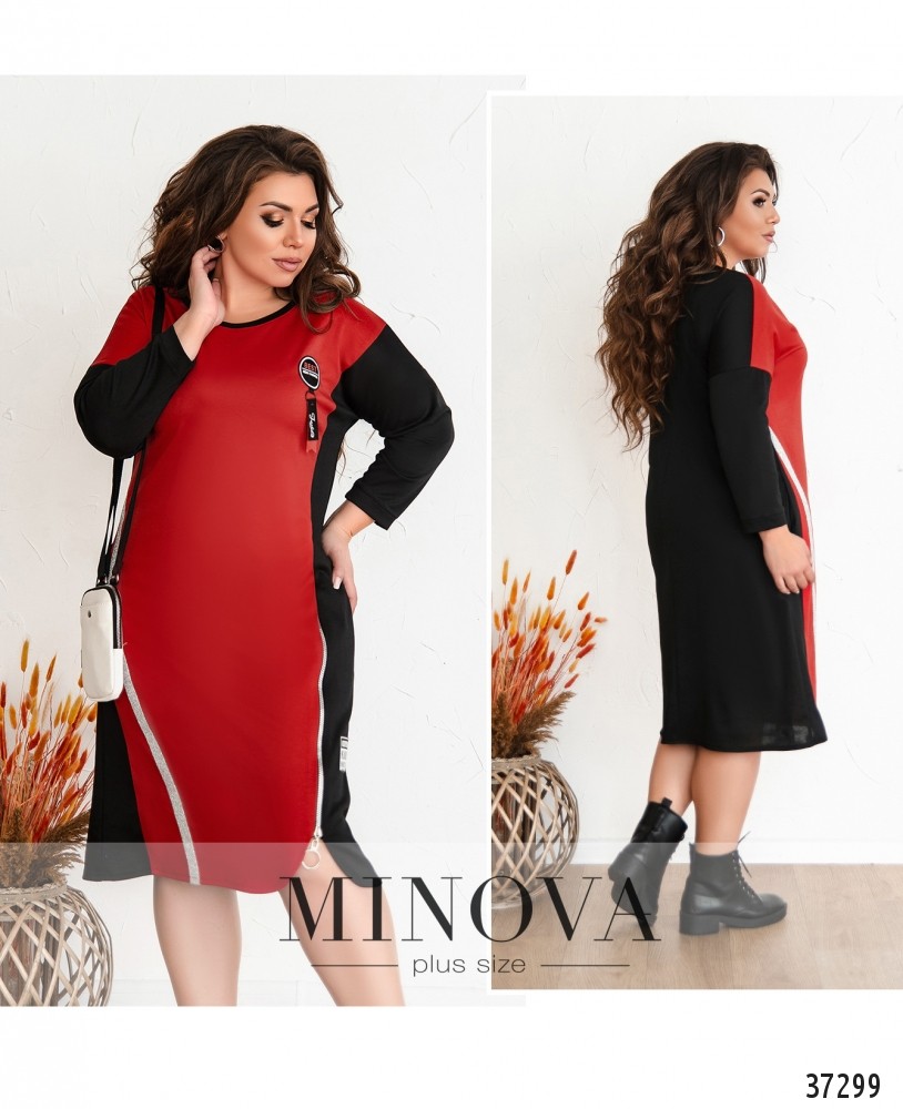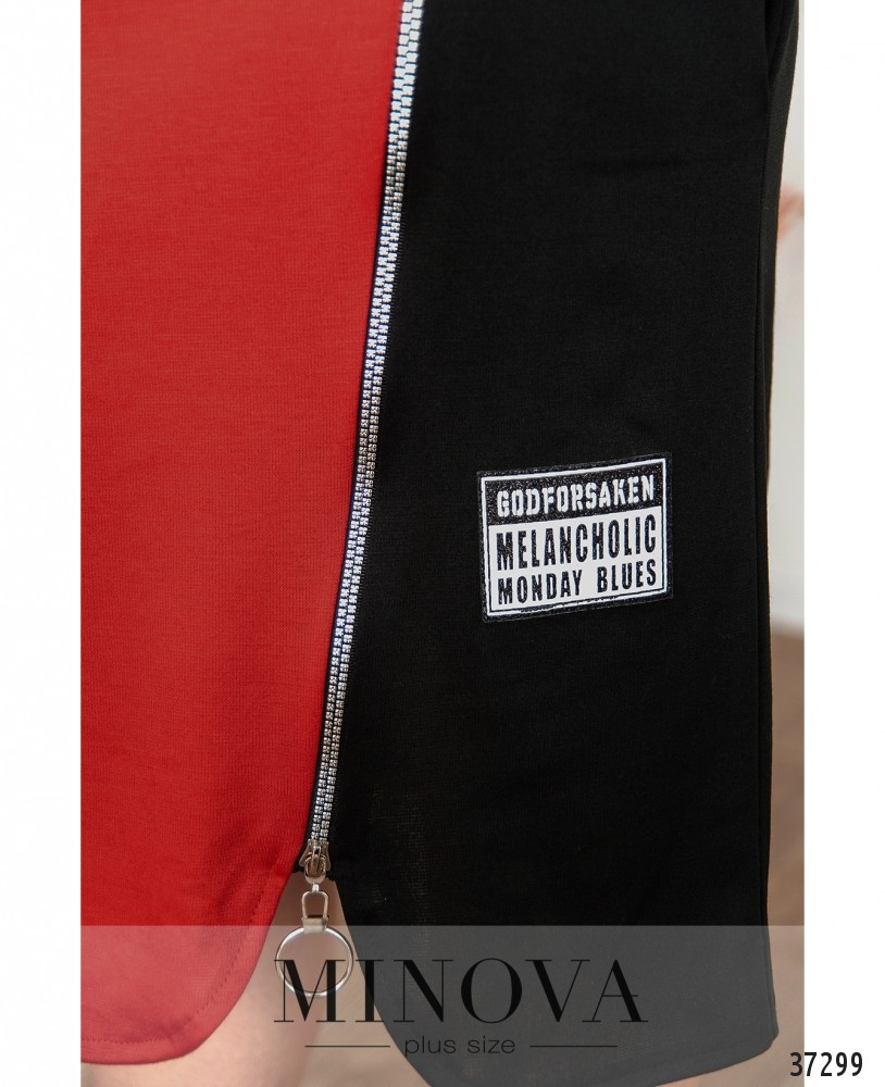 Повседневное яркое платье батал спортивного стиля, ткань мягкая. Застёжек нет. Рукава без манжет, контрастные. На груди – декоративная нашивка с ярлычком. Сбоку справа на подоле – декоративная блестящая лента, слева – рабочая молния и декоративная нашивка с принтом. По бокам – прорезные карманы. Спинка однотонная.