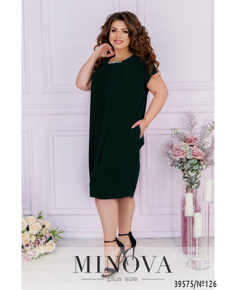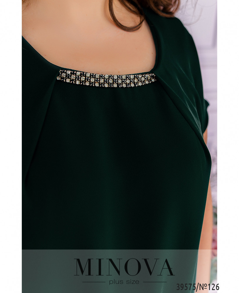 Нарядное и оригинальное платье плюс сайз с иллюзией подшитой накидки. Вырез горловины полукруглый, под ним - декор с камнями, ткань присобрана сверху и снизу. рукава очень короткие, без манжет. По бокам - врезные карманы, застёжек нет.