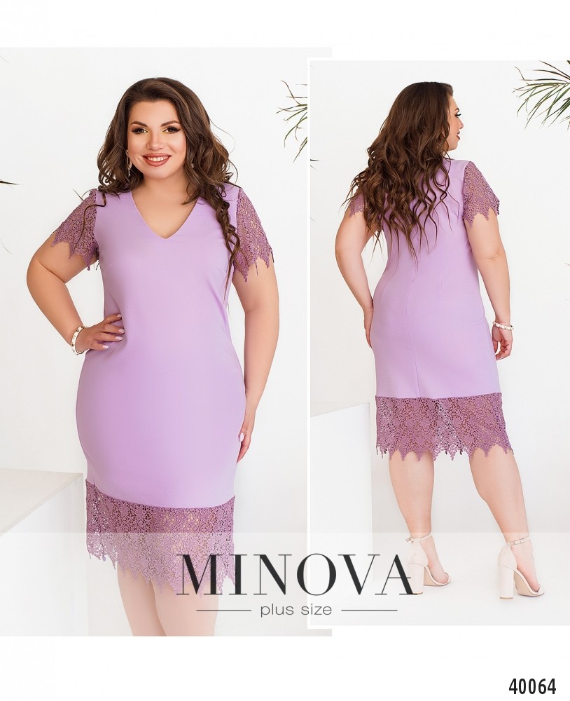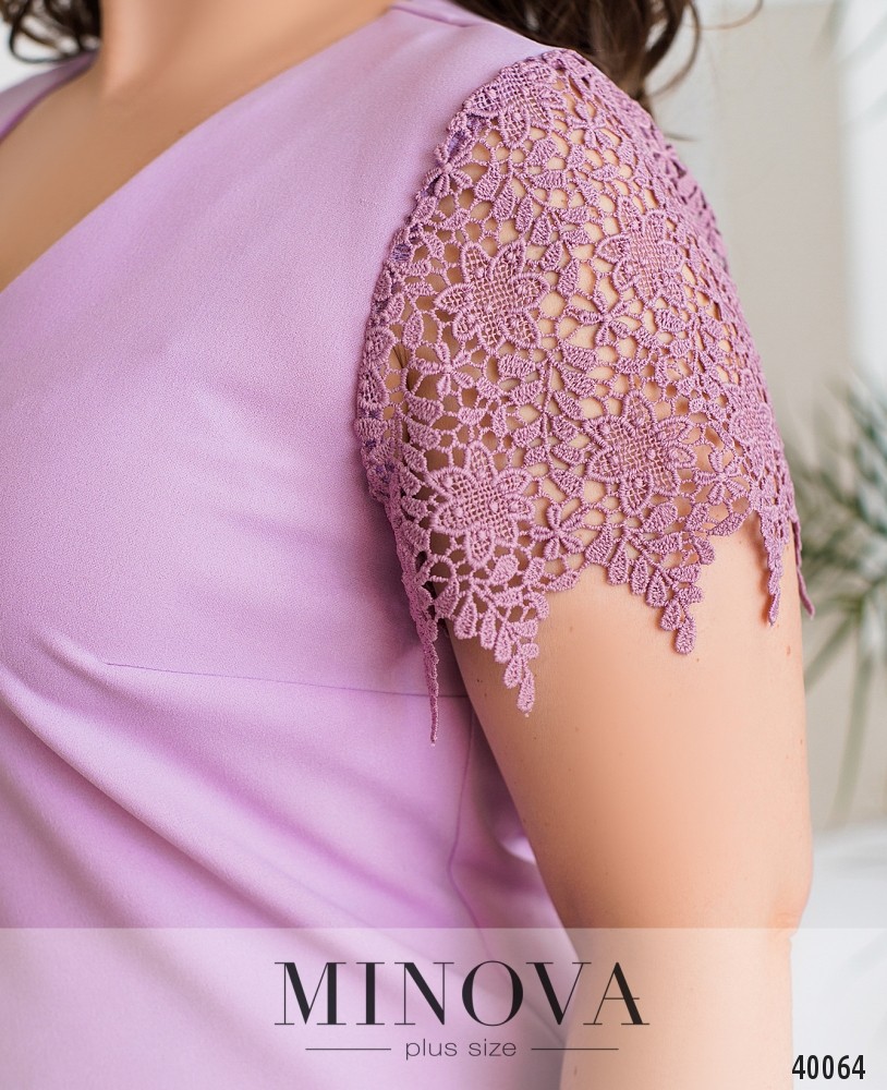 Нарядное коктейльное платье батал с ажурным кружевом на подоле и на рукавах. Вырез горловины V-образный, неглубокий, карманов и застёжек нет. Силуэт приталенный, на груди вытачки.