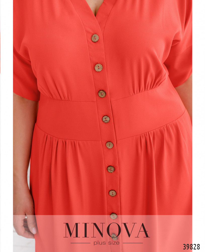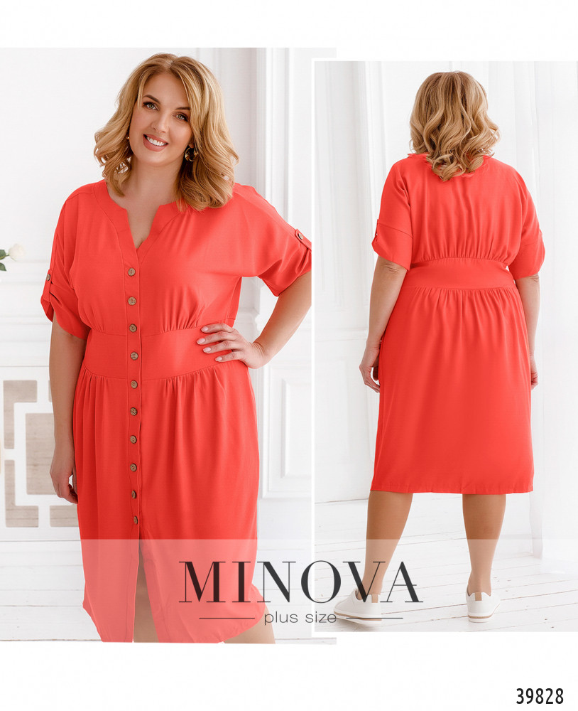 Привлекательное минималистичное платье батал с рядом пуговиц спереди на планке и подчёркнутой талией. Рукава фасона реглан - с подшитой лентой регулировки. Ткань присобрана спереди и по спинке на уровне пояса. Карманов нет.