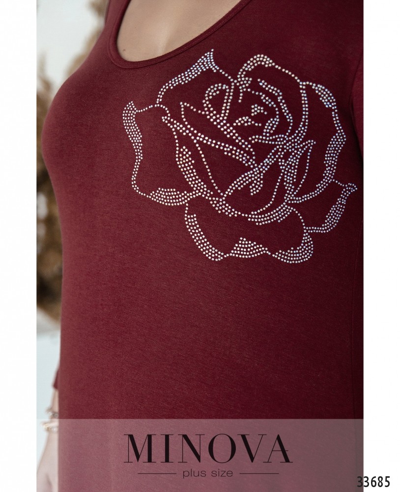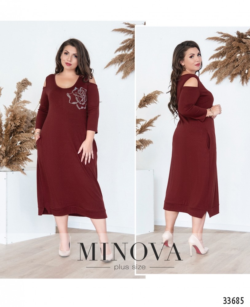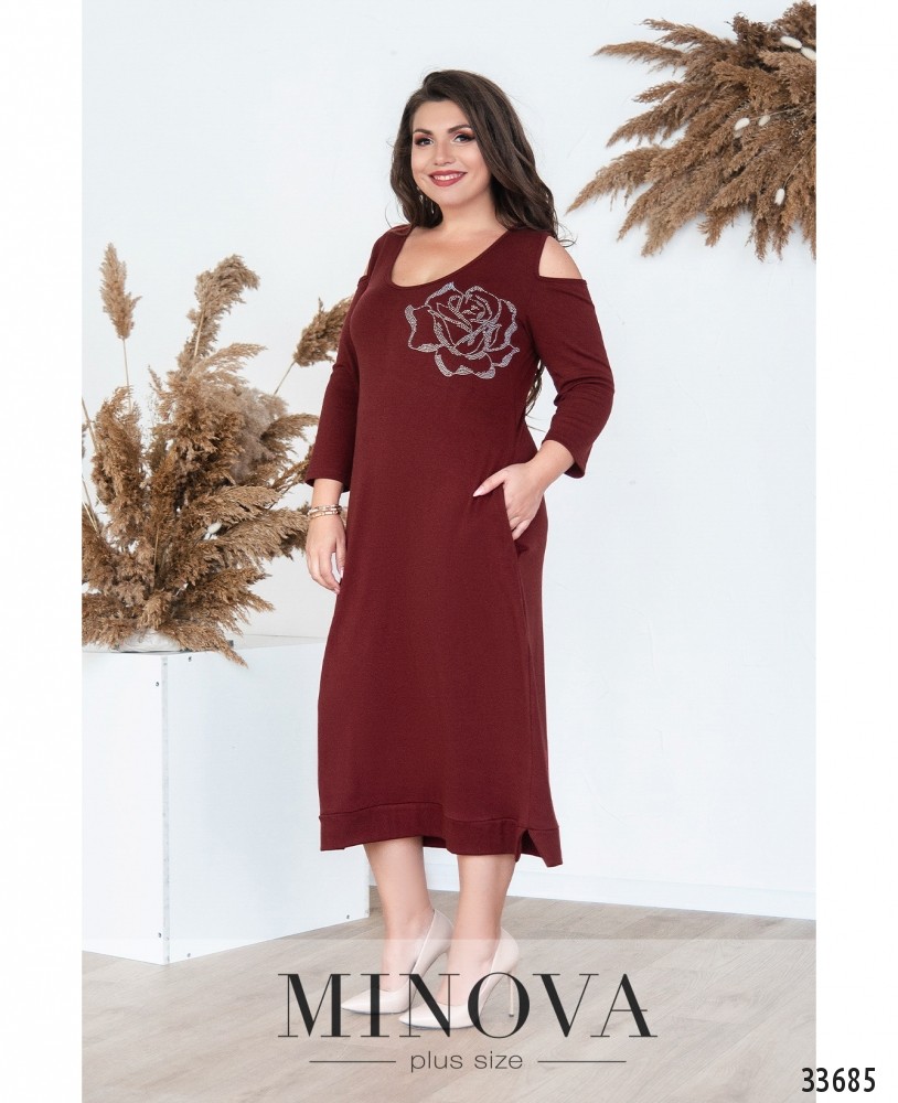 Один декоративный элемент – и даже самое простое платье преображается. Дизайнеры от Minova умеют правильно расставлять акценты. Представленное в новой коллекции платье с глубоким U-образным вырезом горловины выполнено из мягкой, очень приятной и нежной ткани. Застёжки отсутствуют. На левой стороне груди – крупная, тщательно «прорисованная» роза из мелких блестящих страз. Ещё один нюанс – рукава. Плечи остаются слегка приоткрытыми, а ниже рукава длиной ¾. Так что спереди выглядит, будто платье на бретелях, но спинка закрыта полностью. Подол с подшитым манжетом, по бокам разрезы. В наличии врезные карманы по бокам. Такое платье пригодится для создания более нарядного повседневного образа.