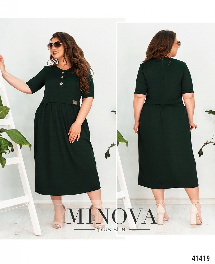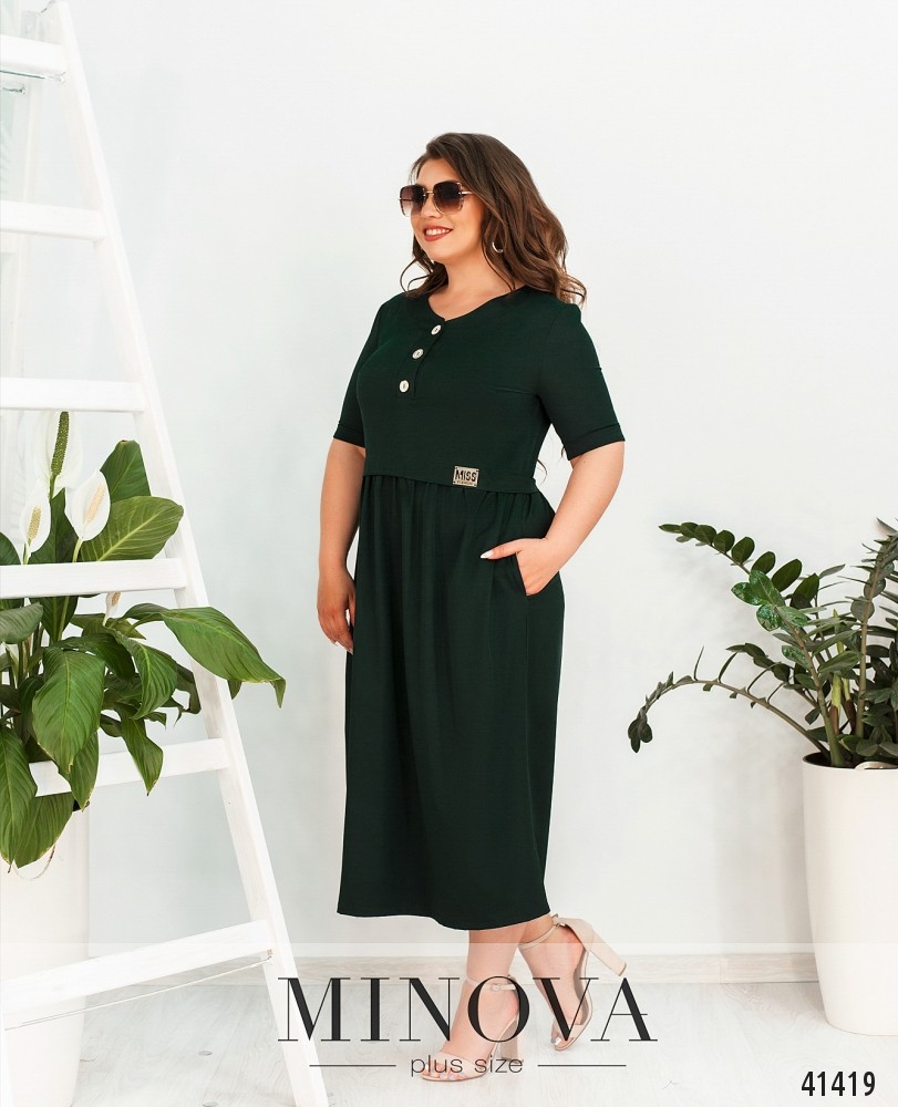 Стильное платье батал со врезными карманами по бокам, пуговицы декоративные, застёжка - вшитая по спинке молния. Рукава с небольшими подворотами, подол подшит к верху, на талии - декоративная нашивка.