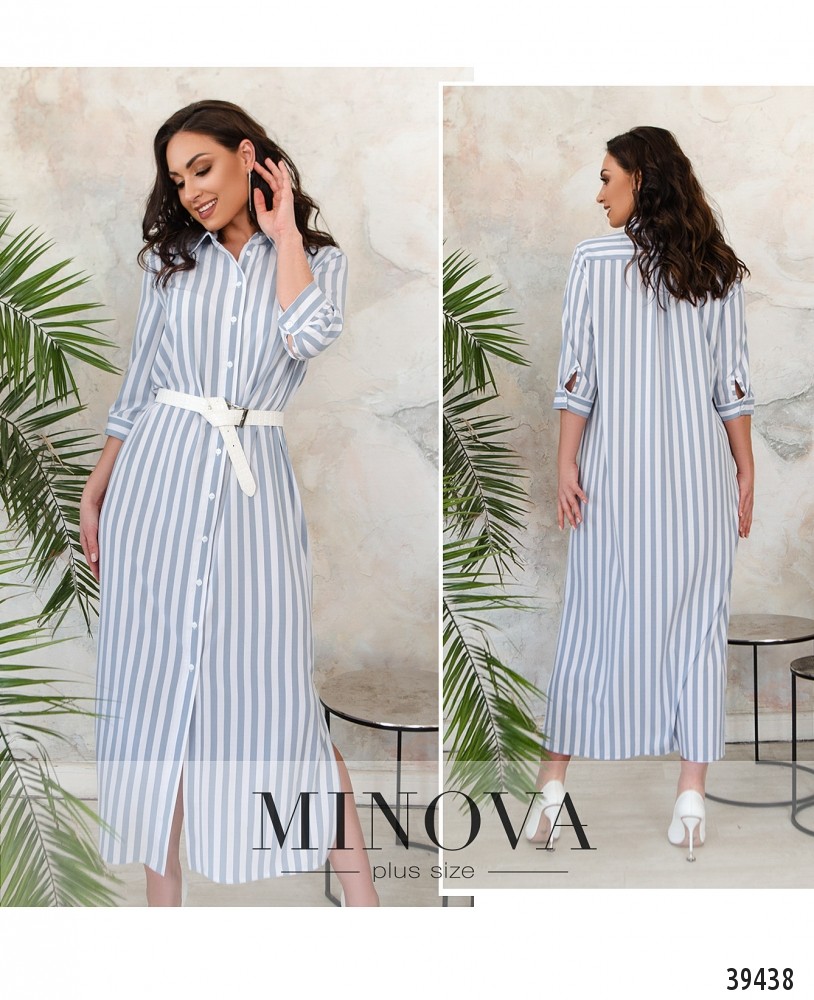 Минималистичное платье макси большого размера, с отложным воротничком, без карманов. Застёгивается на полный ряд пуговиц спереди на планке. На рукавах небольшие манжеты с одной пуговицей. На груди вытачки.
