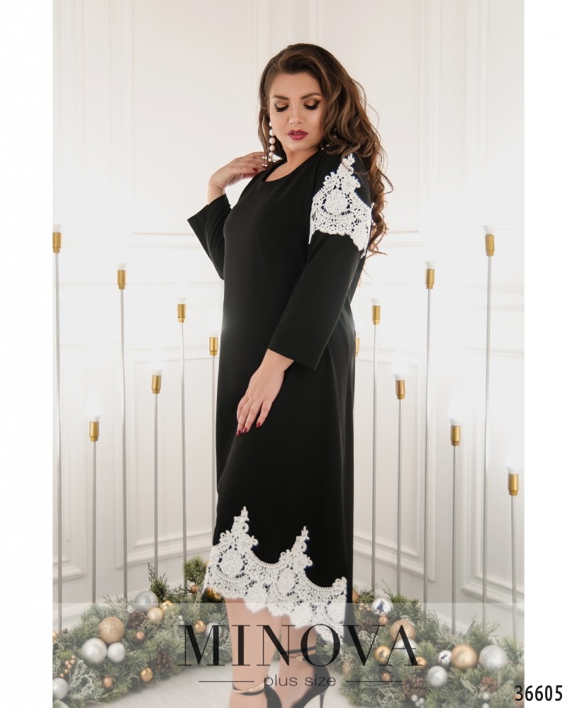 Контрастная вставка изящного кружева украшает это платье батал от Minova на плечах и на подоле спереди. Подол асимметричный, по спинке чуть длиннее. Платье А-силуэта выглядит по-настоящему нарядно и привлекательно, особенно благодаря оригинальным расцветкам. Модель в чёрном цвете с белым кружевом особенно необычна! Но вы можете выбрать и более сдержанные тона. Платье без карманов и застёжек, рукава длиной ¾, без манжет. На груди – диагональные вытачки. Вырез горловины полукруглый, чуть глубже стандарта. В комплекте прилагается нежная подвеска на длинной цепочке.