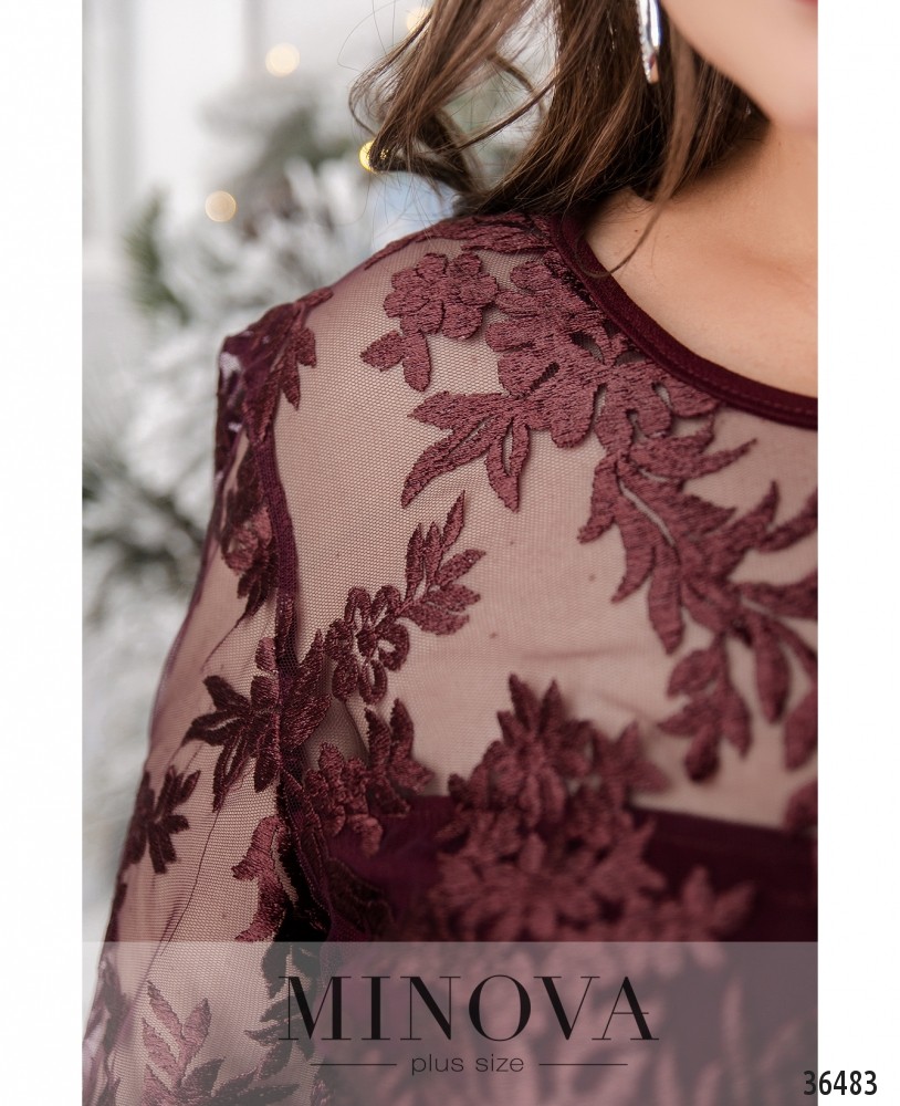 Ажурное блестящее кружево расположено на представленной модели платья батал на подоле спереди и сверху, в виде накидки. Minova предлагает в новом каталоге нарядное платье прямого кроя из мягкой, приятной ткани. Платье без застёжек и карманов, с небольшими вытачками на груди. Рукава полностью из кружева, без подкладок. На лифе кружево с подкладкой, прикрывающей грудь, а плечи - полупрозрачные. Спинка полностью закрыта, снизу сзади – небольшая шлица. Выберите пастельный или глубокий оттенок красного, синего или чёрного, и дополните образ удачно выбранной обувью.