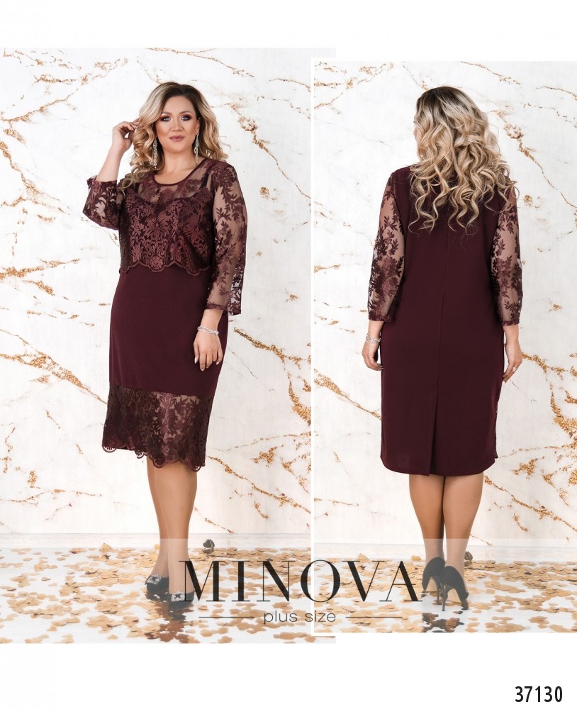 Ажурное блестящее кружево расположено на представленной модели платья батал на подоле спереди и сверху, в виде накидки. Minova предлагает в новом каталоге нарядное платье прямого кроя из мягкой, приятной ткани. Платье без застёжек и карманов, с небольшими вытачками на груди. Рукава полностью из кружева, без подкладок. На лифе кружево с подкладкой, прикрывающей грудь, а плечи - полупрозрачные. Спинка полностью закрыта, снизу сзади – небольшая шлица. Выберите пастельный или глубокий оттенок красного, синего или чёрного, и дополните образ удачно выбранной обувью.