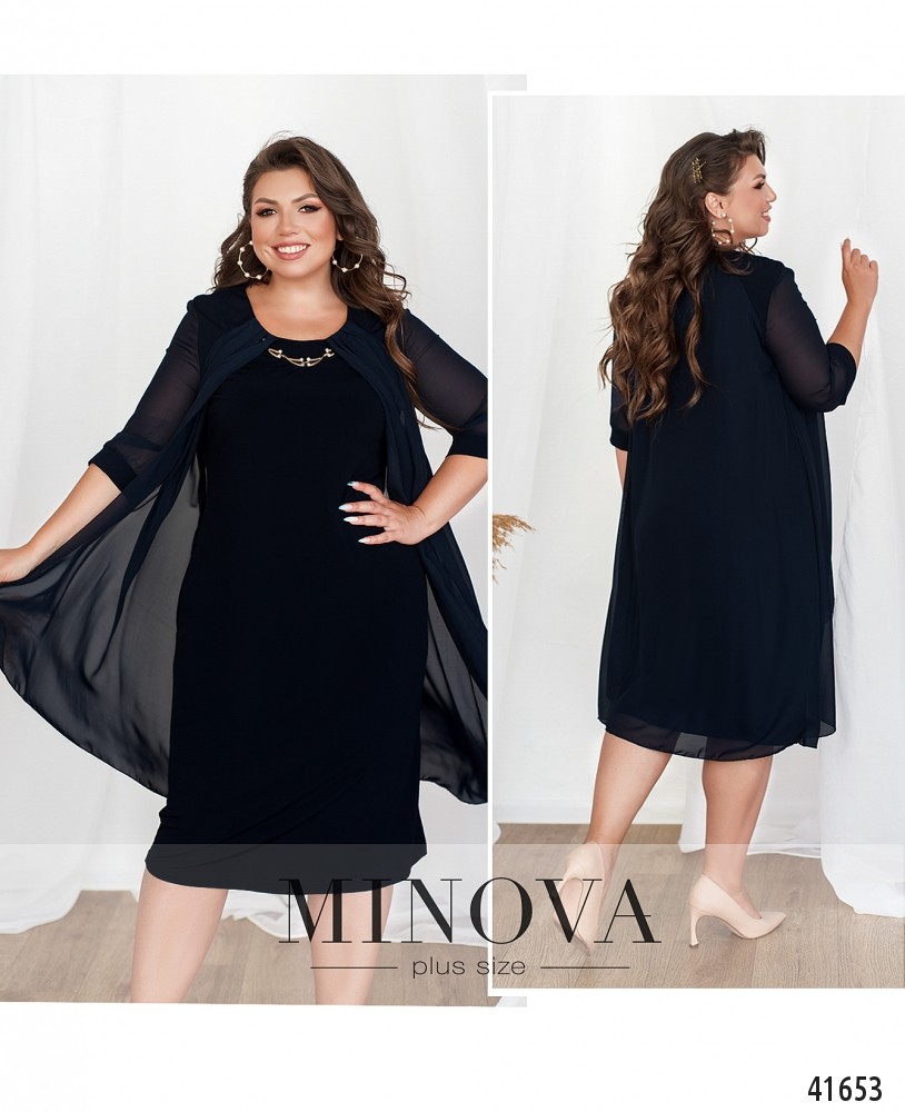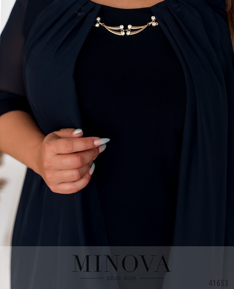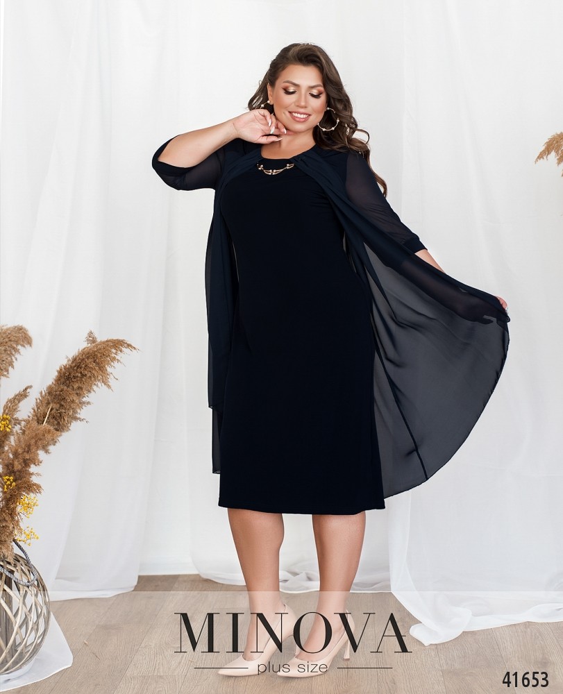 Стильное платье батал с полукруглым вырезом горловины, украшенным декором. Сверху подшита накидка, платье двуслойное, рукава с небольшими манжетами, полупрозрачные. Без застёжек и карманов.