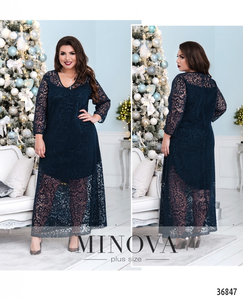 Нежное и нарядное двойное платье батал из новой коллекции Minova позволит вам создать нарядный и очаровательный образ. Платье состоит из двух частей. Нижнее – на тонких лямках, с вытачками на груди, без карманов и застёжек, приталенное, длиной выше колена. Вырез горловины в виде фигурного каре. Верхняя накидка выполнена из сеточки с бархатным гипюром, вырез горловины V-образный. Накидка цельная, без застёжек и карманов, длины миди, с рукавами длиной ¾ без манжет. Накидка А-силуэта. В целом наряд производит очень приятное впечатление, вы можете выбрать пастельный или глубокий оттенок и дополнить образ украшениями и подходящей обувью.