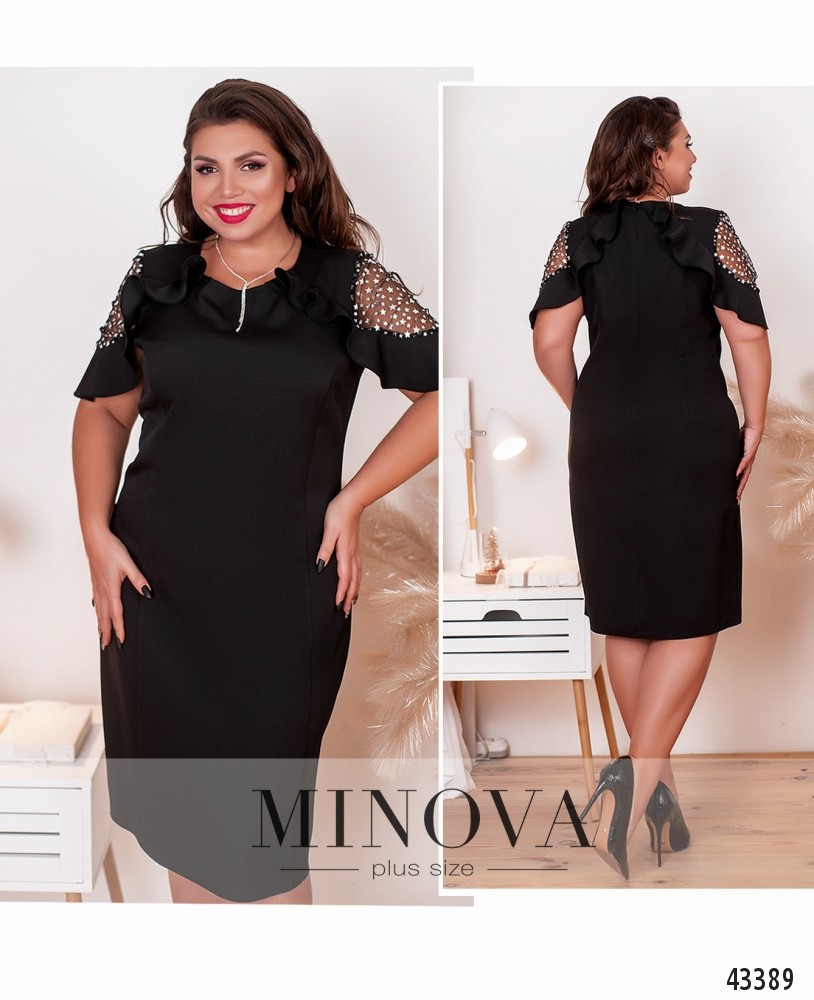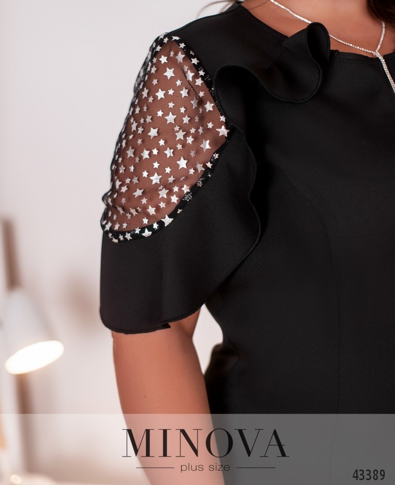 Романтичное платье большого размера с оборками на груди, рукавах и спинке. Спереди и на спине - продольные вытачки, силуэт приталенный. Рукава из полупрозрачной сеточки со звёздами. Застёжка - молния, вшитая по спинке. Карманов нет.