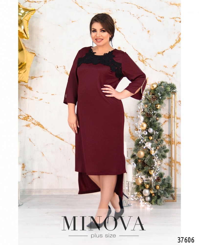 Привлекательное и оригинальное платье с кружевом и контрастными рабочими змейками: сзади на спине и на рукавах. По спинке молния во всю длину, снизу на подоле шлица, спереди подол короче, по бокам длинные разрезы. Рукава без манжет. Ткань с люрексом. Вырез горловины полукруглый, неглубокий и неширокий.