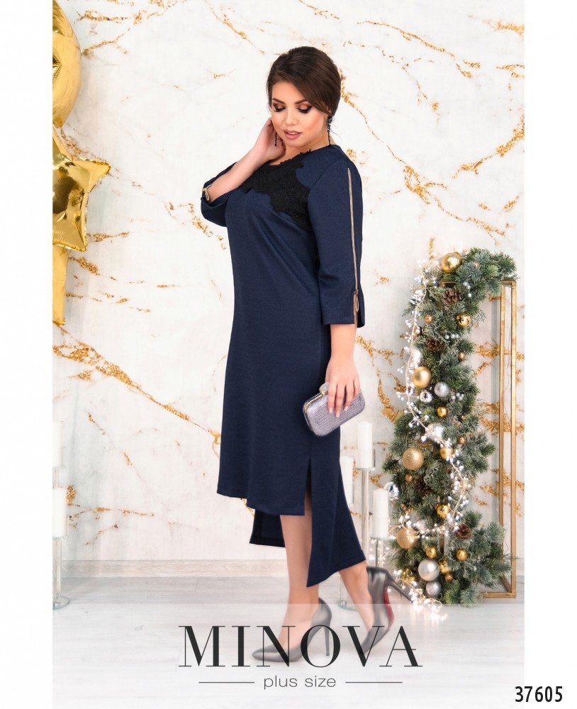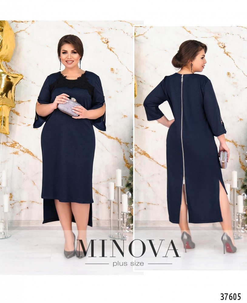 Привлекательное и оригинальное платье с кружевом и контрастными рабочими змейками: сзади на спине и на рукавах. По спинке молния во всю длину, снизу на подоле шлица, спереди подол короче, по бокам длинные разрезы. Рукава без манжет. Ткань с люрексом. Вырез горловины полукруглый, неглубокий и неширокий.