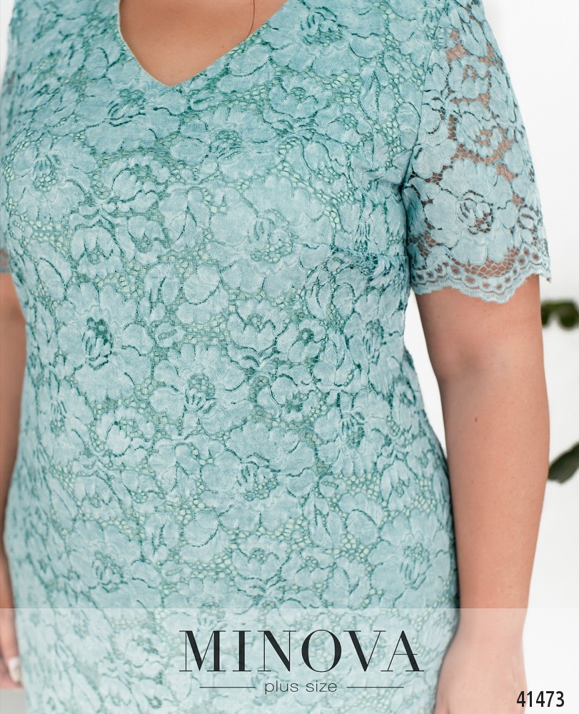Изящное приталенное платье батал без карманов, с ажурным гипюровым верхним слоем и нижним подкладочным, мягким. Вырез горловины полукруглый, застёжка - вшитая по спинке молния чуть ниже выреза горловины. Рукава короткие, без манжет. На груди вытачки.