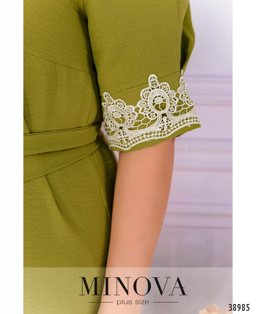 Нежное минималистичное платье батал, украшенное кружевом на подоле и на рукавах. Вырез декольте глубокий, V-образный, на груди - вытачки, без застёжек и карманов.