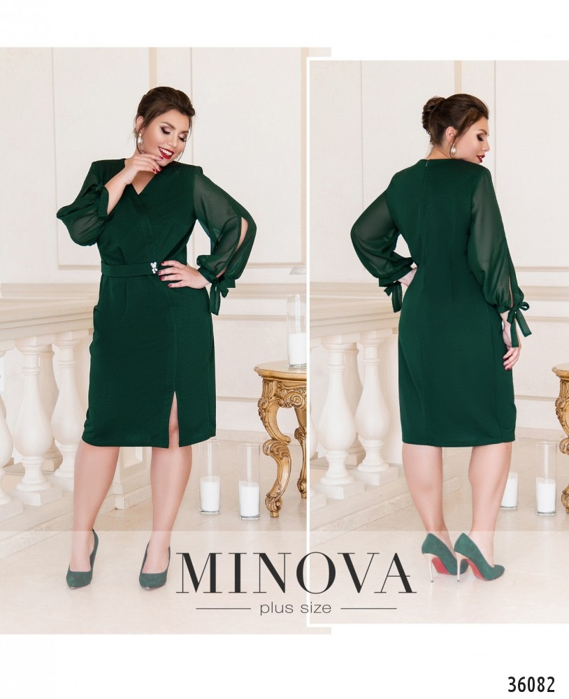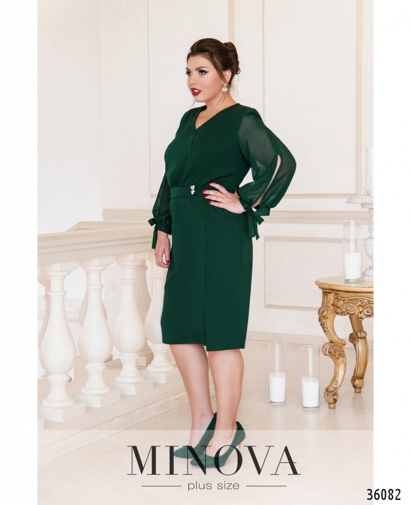 Оригинальное приталенное платье батал из свежей коллекции женской одежды больших размеров от Minova. Платье однотонное, мягких пастельных оттенков, без принта или узоров, поэтому вы можете смело экспериментировать с аксессуарами. Вырез горловины V-образный, на груди – небольшие вытачки, рукава изготовлены из сеточки, манжеты мягкие, завязываются на бант. Застёжка – вшитая по спинке змейка, карманов нет. Спереди справа подол подшит к лифу и присобран, украшен небольшим пришитым пояском с украшением; платье выглядит запахнутым, но запАх подшит, только слева на подоле небольшой разрез. На плечах изнутри мягкие накладки для выравнивания линии плеч. Можно носить и с обувью на каблуках, и на плоском ходу.