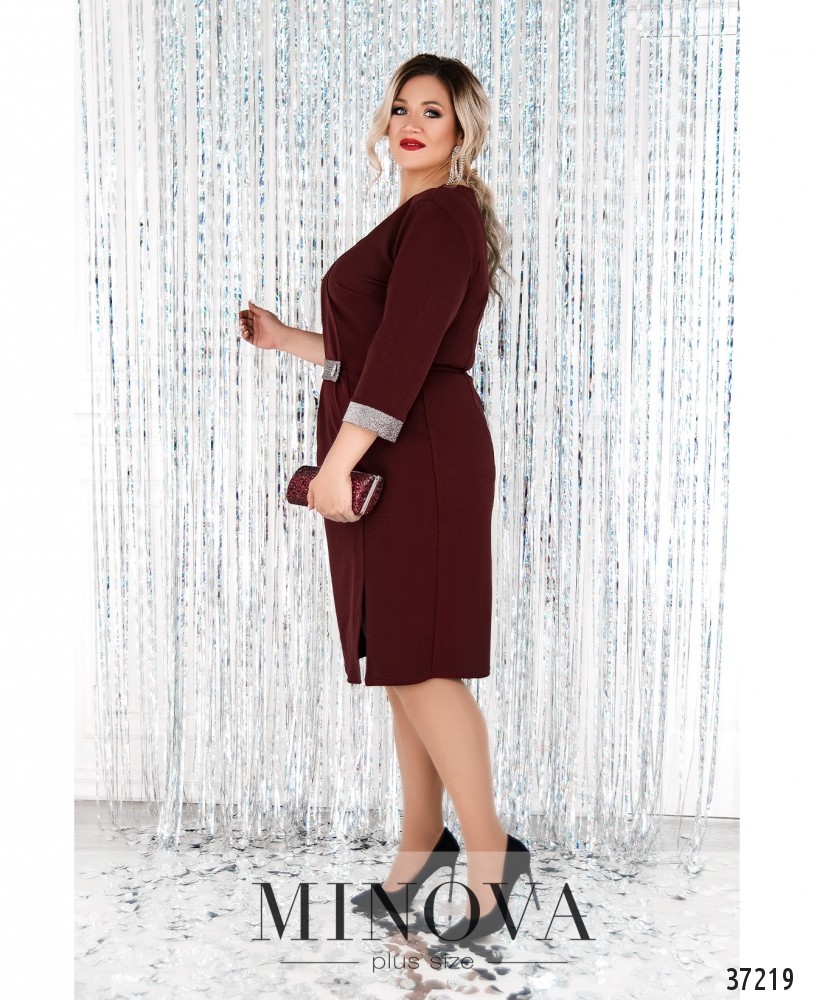 Необычное приталенное платье батал из нового каталога Minova приталено и выглядит запахнутым, но «запАх» подшит, только на подоле снизу слева – вырез. На груди – небольшие вытачки, вырез горловины V-образный. Рукава длины 3/4. Манжеты и подшитый поясок изготовлены из ткани с нитями люрекса, и это придаёт платью очень нарядный вид. Застёжка – вшитая по спинке змейка, карманы отсутствуют. Подол справа подшит к верху. Прекрасный выбор для в меру торжественного мероприятия, стоит дополнить образ блестящими аксессуарами и обувью на каблуке.