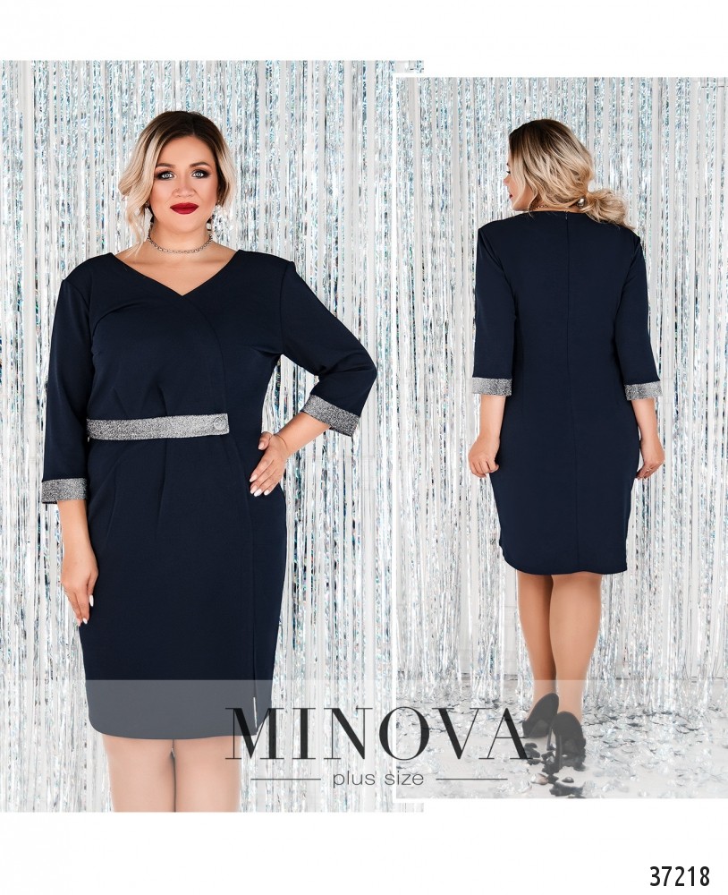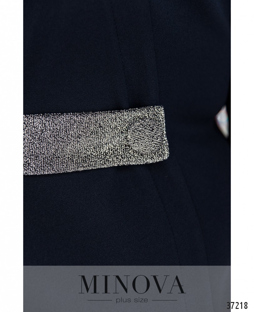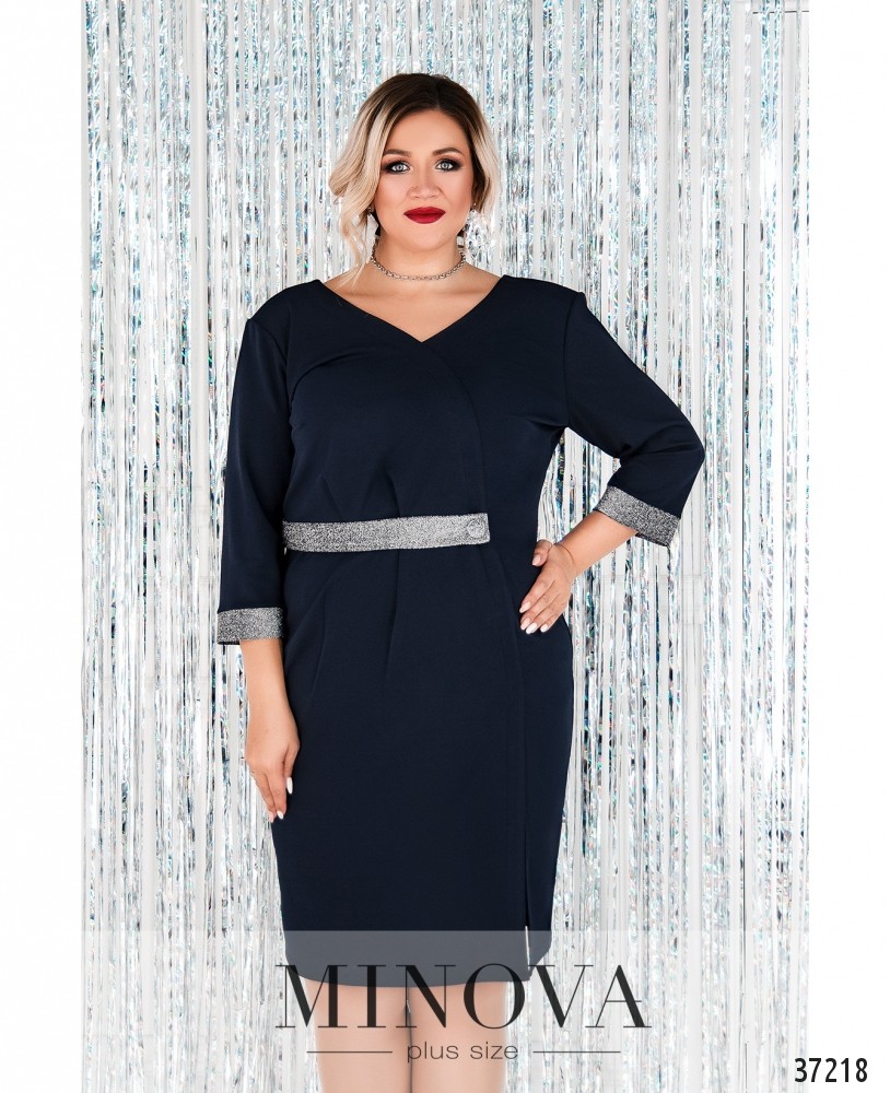 Необычное приталенное платье батал из нового каталога Minova приталено и выглядит запахнутым, но «запАх» подшит, только на подоле снизу слева – вырез. На груди – небольшие вытачки, вырез горловины V-образный. Рукава длины 3/4. Манжеты и подшитый поясок изготовлены из ткани с нитями люрекса, и это придаёт платью очень нарядный вид. Застёжка – вшитая по спинке змейка, карманы отсутствуют. Подол справа подшит к верху. Прекрасный выбор для в меру торжественного мероприятия, стоит дополнить образ блестящими аксессуарами и обувью на каблуке.