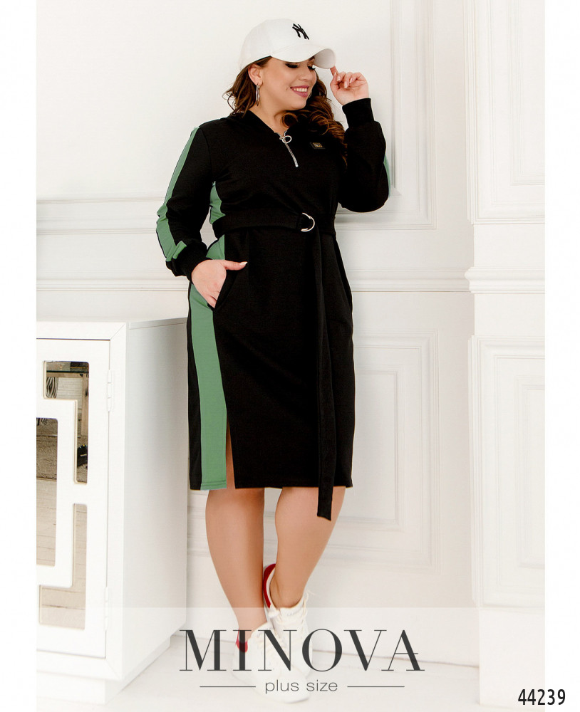 Удобное платье плюс сайз в спортивном стиле, в комплекте - пояс с двумя металлическими полукольцами. Рукава с мягкими манжетами, по бокам - карманы в шве, на подоле по бокам разрезы, а также лампасы (такие же лампасы и на рукавах). Застёжка - молния спереди по центру до середины груди, на груди нашивка. Есть капюшон без шнурков.