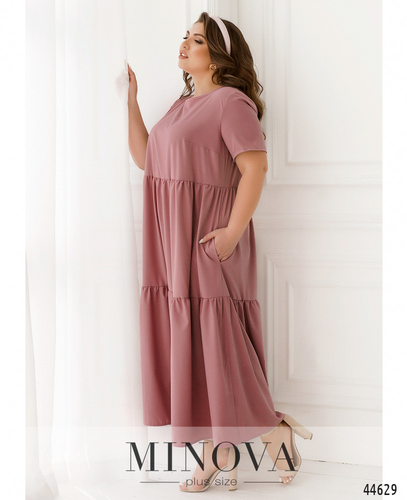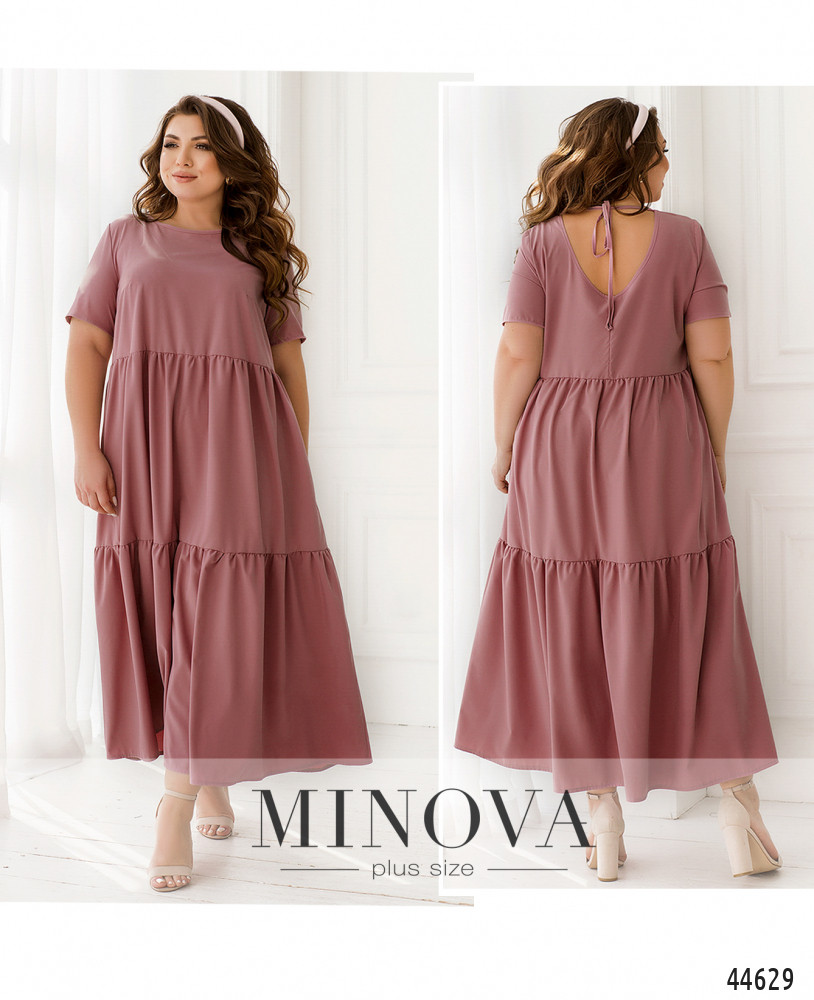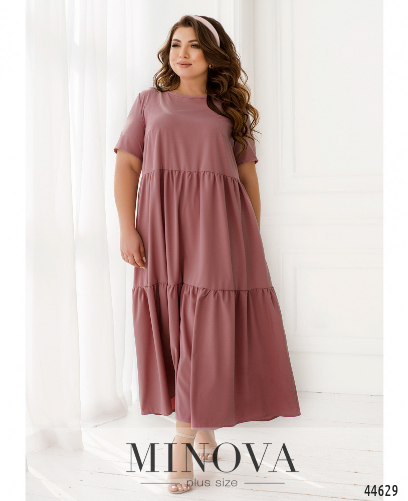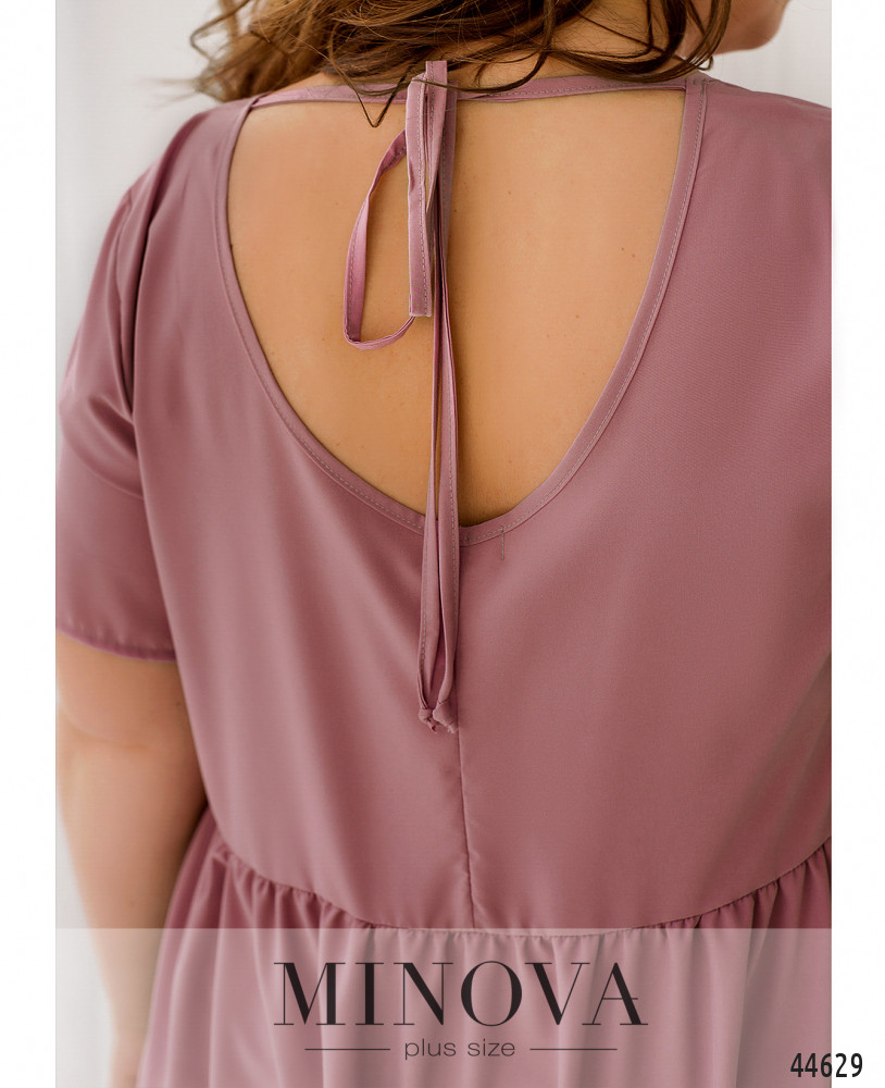 Минималистичное платье батал А-силуэта, подол с мягкими длинными оборками. Рукава короткие, без манжет. Застёжек нет. Сзади на шее подшита лента-завязка. На груди вытачки. Вырез горловины неглубокий.