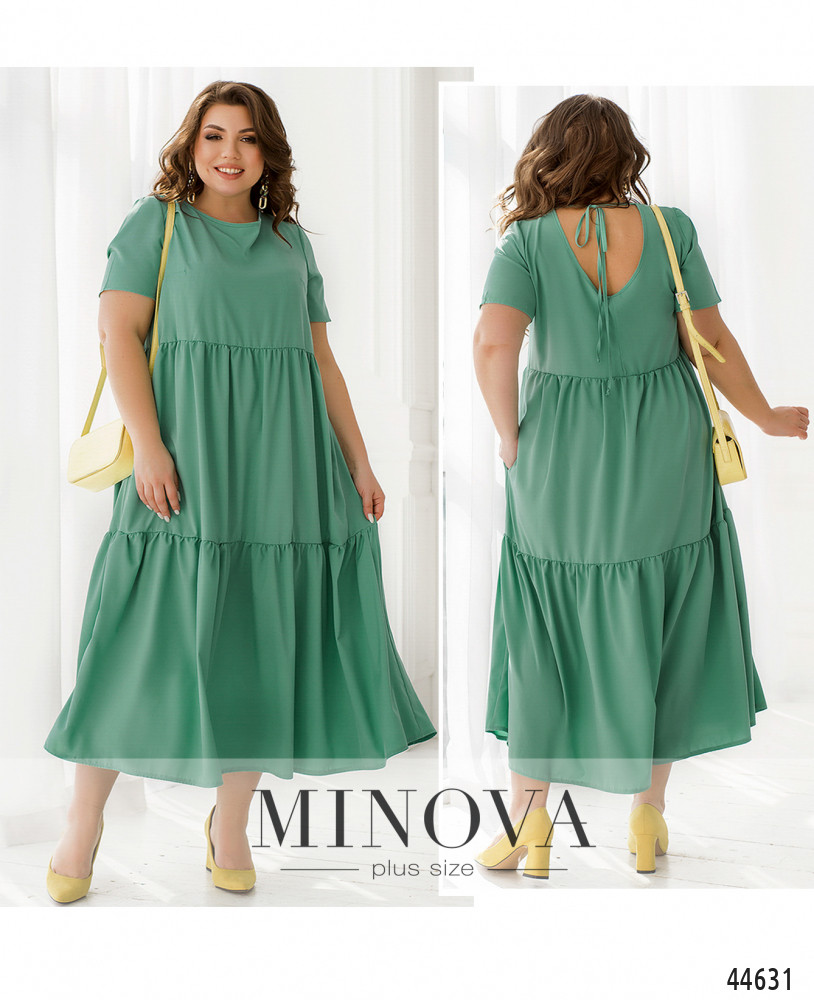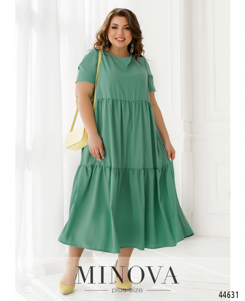 Минималистичное платье батал А-силуэта, подол с мягкими длинными оборками. Рукава короткие, без манжет. Застёжек нет. Сзади на шее подшита лента-завязка. На груди вытачки. Вырез горловины неглубокий.