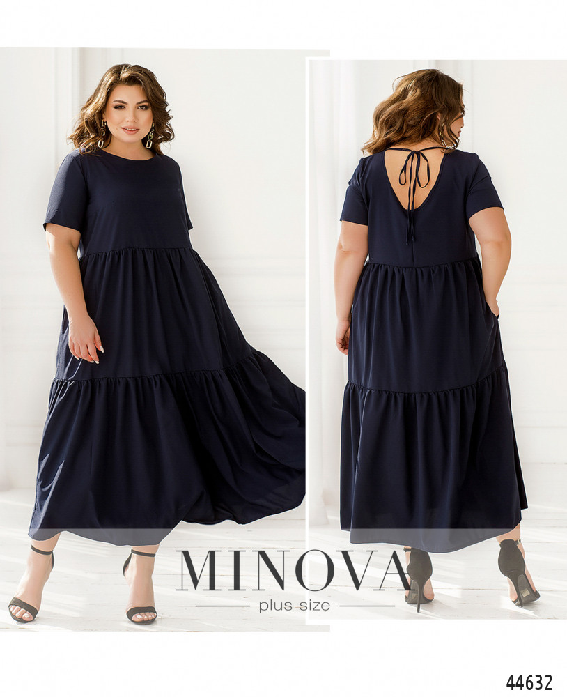 Минималистичное платье батал А-силуэта, подол с мягкими длинными оборками. Рукава короткие, без манжет. Застёжек нет. Сзади на шее подшита лента-завязка. На груди вытачки. Вырез горловины неглубокий.