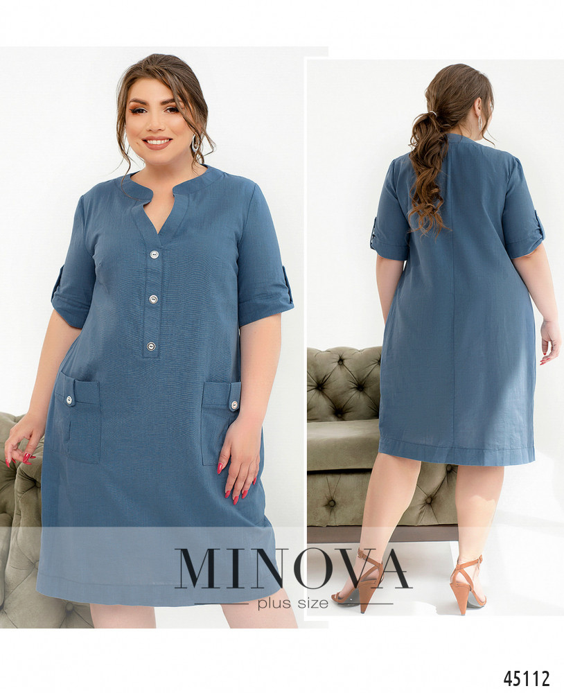 Стильное лёгкое платье плюс сайз с накладными карманами на бёдрах, украшенными декоративными пуговицами. Такие же декоративные пуговицы - от выреза горловины до талии. Рукава без манжет, с декоративной регулировочной лентой. На груди вытачки. Застёжка - вшитая в боковой шов потайная молния.