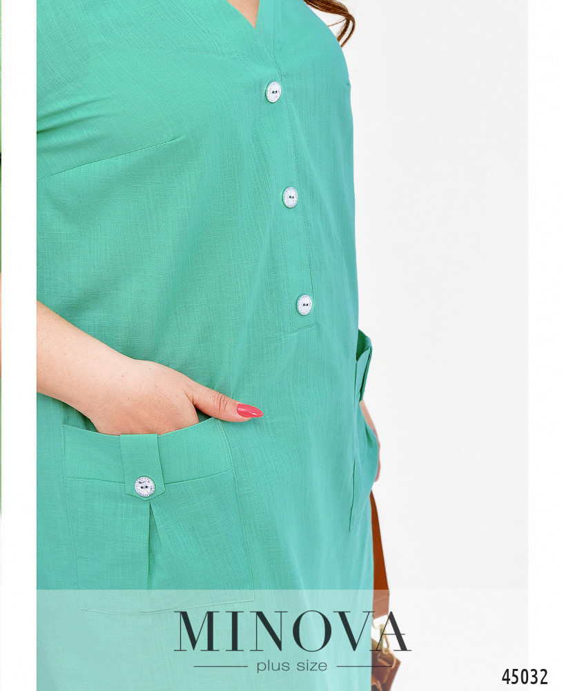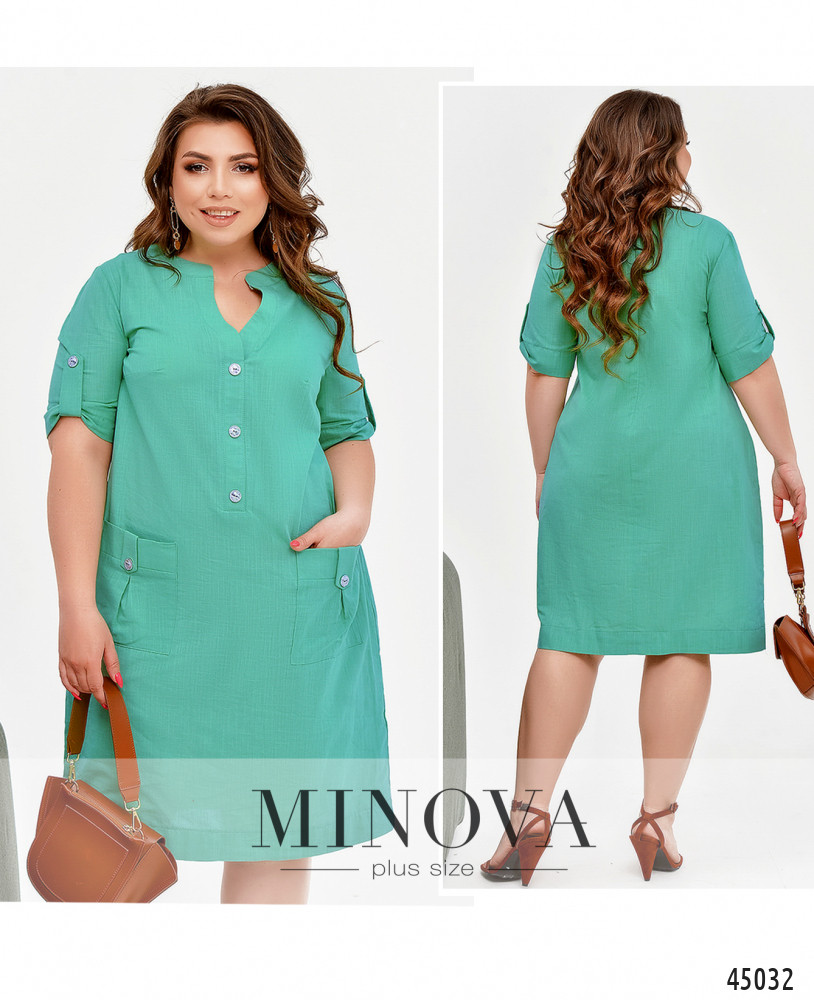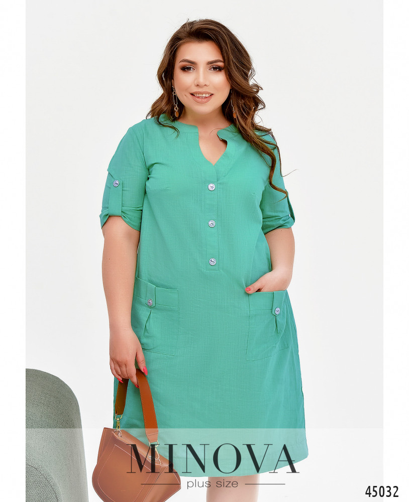 Стильное лёгкое платье плюс сайз с накладными карманами на бёдрах, украшенными декоративными пуговицами. Такие же декоративные пуговицы - от выреза горловины до талии. Рукава без манжет, с декоративной регулировочной лентой. На груди вытачки. Застёжка - вшитая в боковой шов потайная молния.