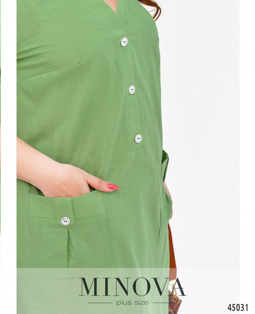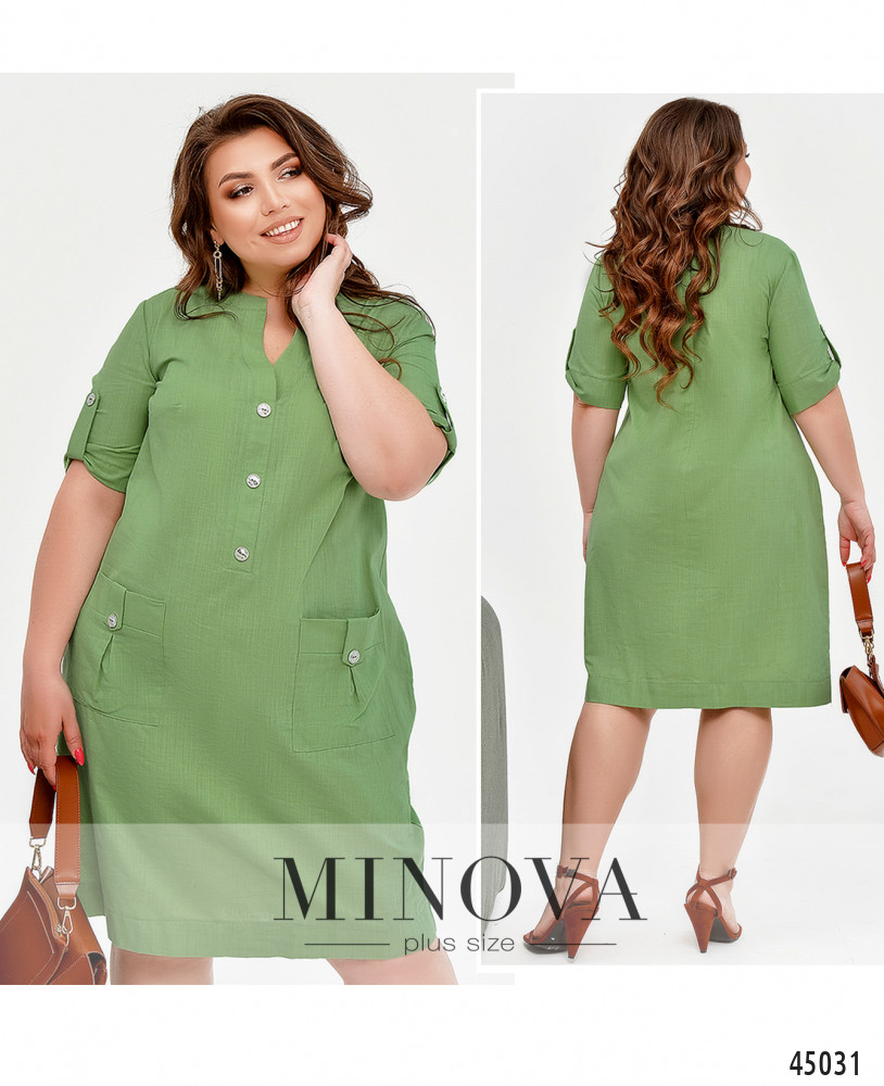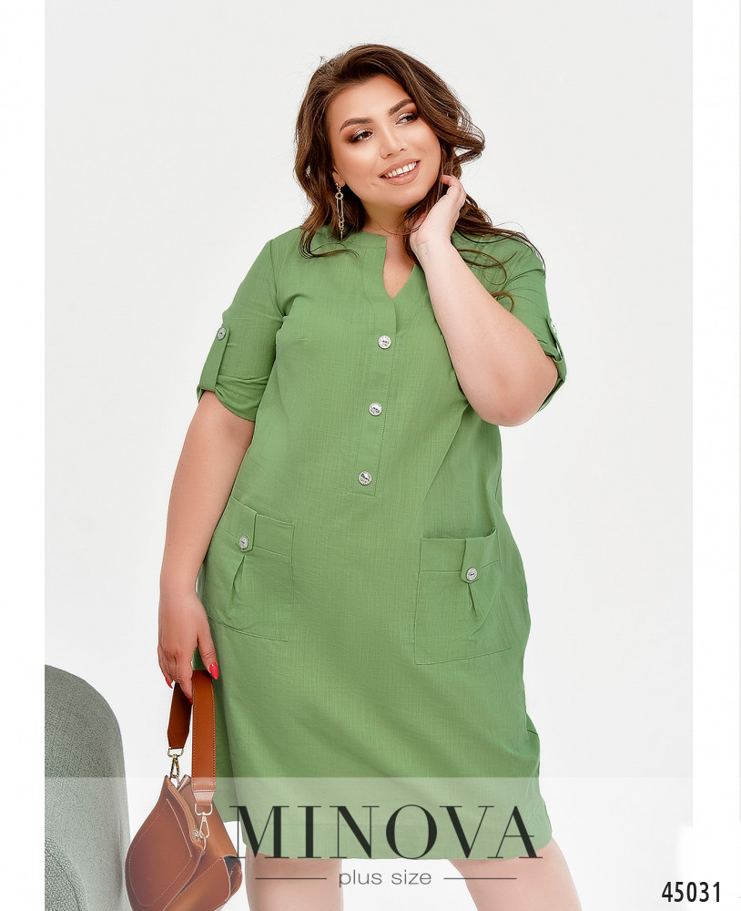 Стильное лёгкое платье плюс сайз с накладными карманами на бёдрах, украшенными декоративными пуговицами. Такие же декоративные пуговицы - от выреза горловины до талии. Рукава без манжет, с декоративной регулировочной лентой. На груди вытачки. Застёжка - вшитая в боковой шов потайная молния.