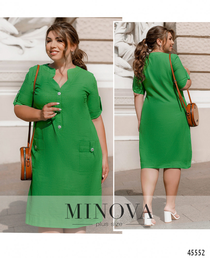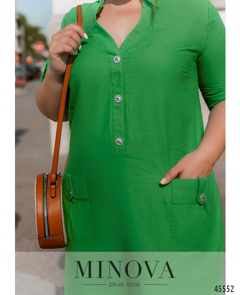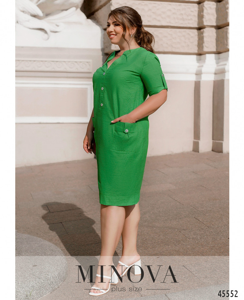 Стильное лёгкое платье плюс сайз с накладными карманами на бёдрах, украшенными декоративными пуговицами. Такие же декоративные пуговицы - от выреза горловины до талии. Рукава без манжет, с декоративной регулировочной лентой. На груди вытачки. Застёжка - вшитая в боковой шов потайная молния. Пояс НЕ входит в комплект.