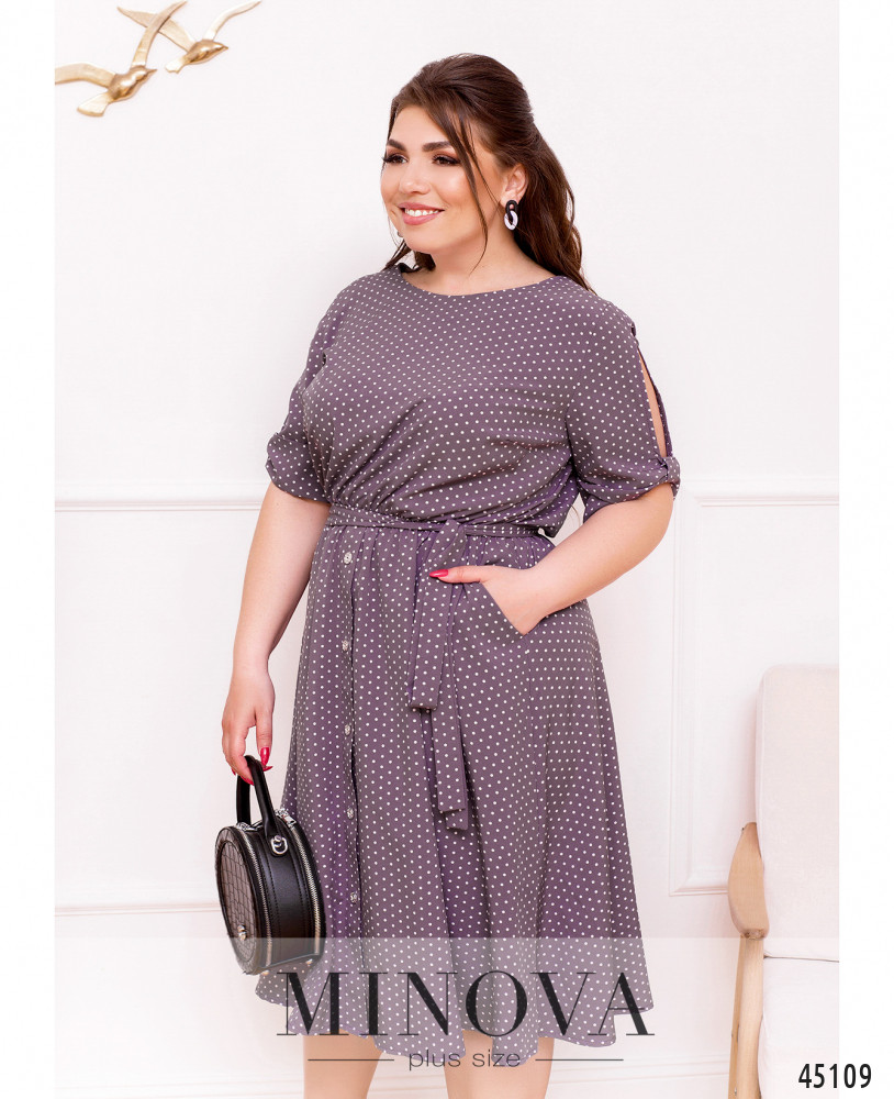 Лёгкое платье большого размера в горошек, украшено декоративными пуговицами на подоле (спереди) и на лифе (по спинке). Вырез горловины спереди полукруглый, сзади V-образный. В пояс вшита резинка, по бокам - врезные карманы. Рукава с прорезями и "бантами"-манжетами. На груди вытачки. Застёжек нет.