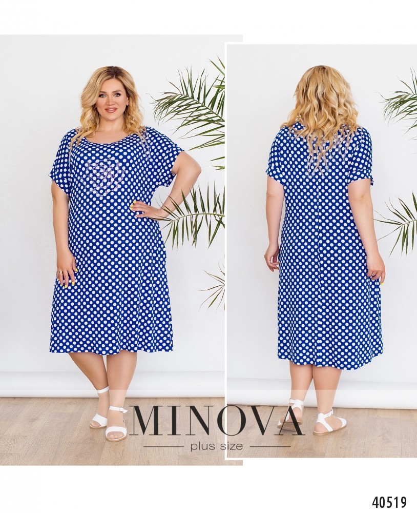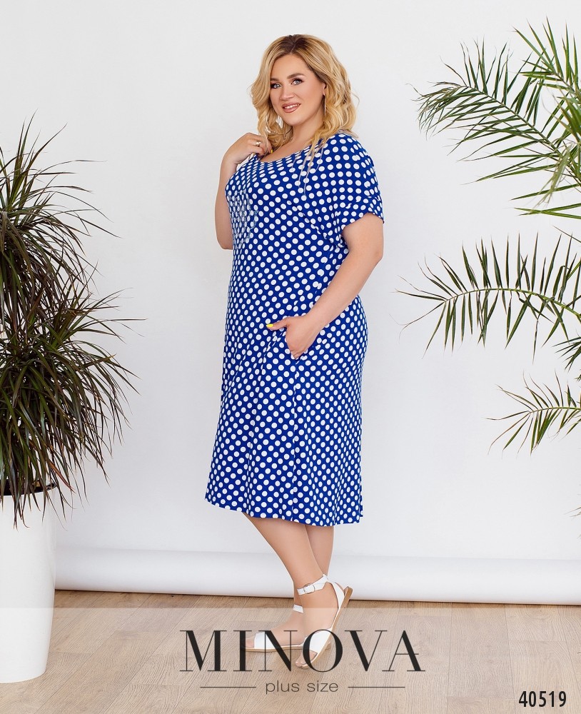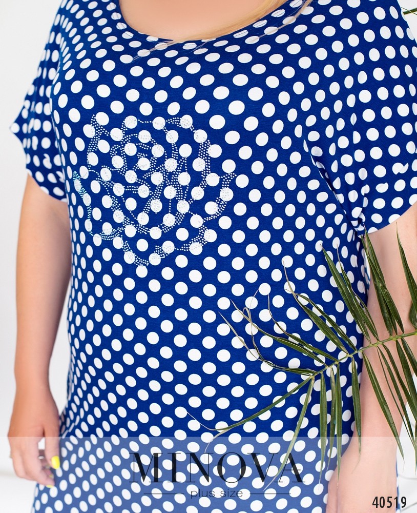 Очаровательное платье батал без застёжек, с вырезом горловины "лодочка", по бокам - врезные карманы, рукава короткие, с отворотами. На груди - едва заметный цветок, выложенный стразами. Украшение входит в комплект.