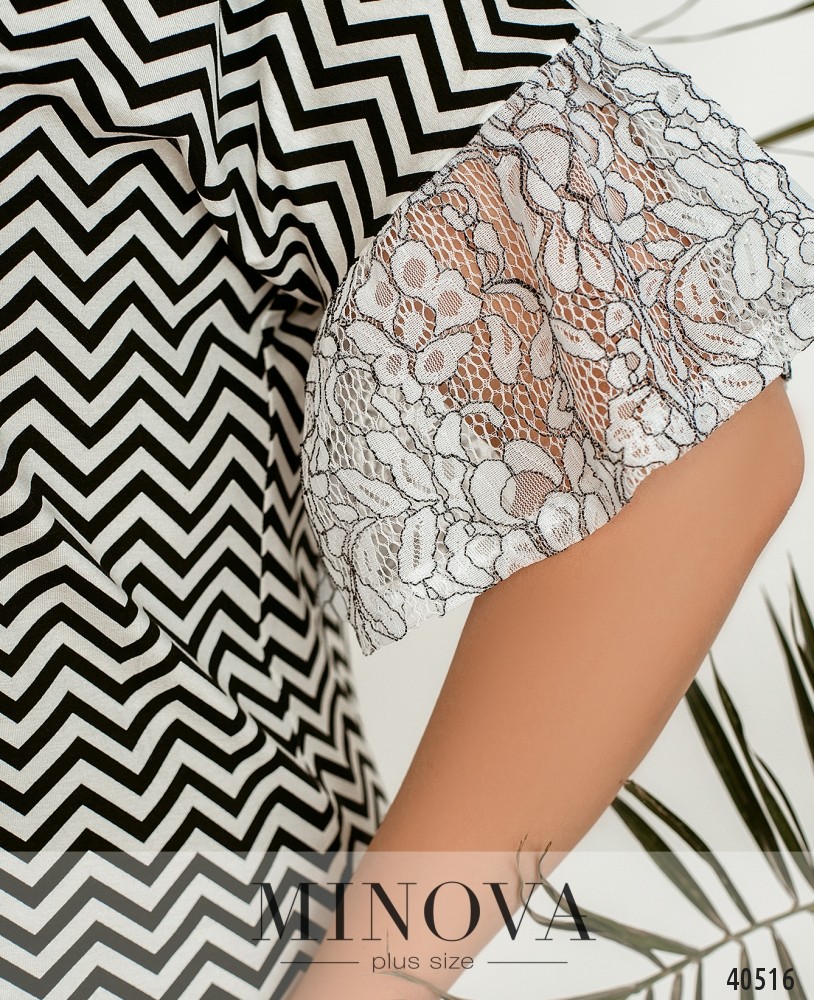 Оригинальное платье батал с узором, выложенным из страз, на груди. Рукава оторочены нежным кружевом. Вырез горловины широкий. Застёжек и карманов нет. Украшение входит в комплект.