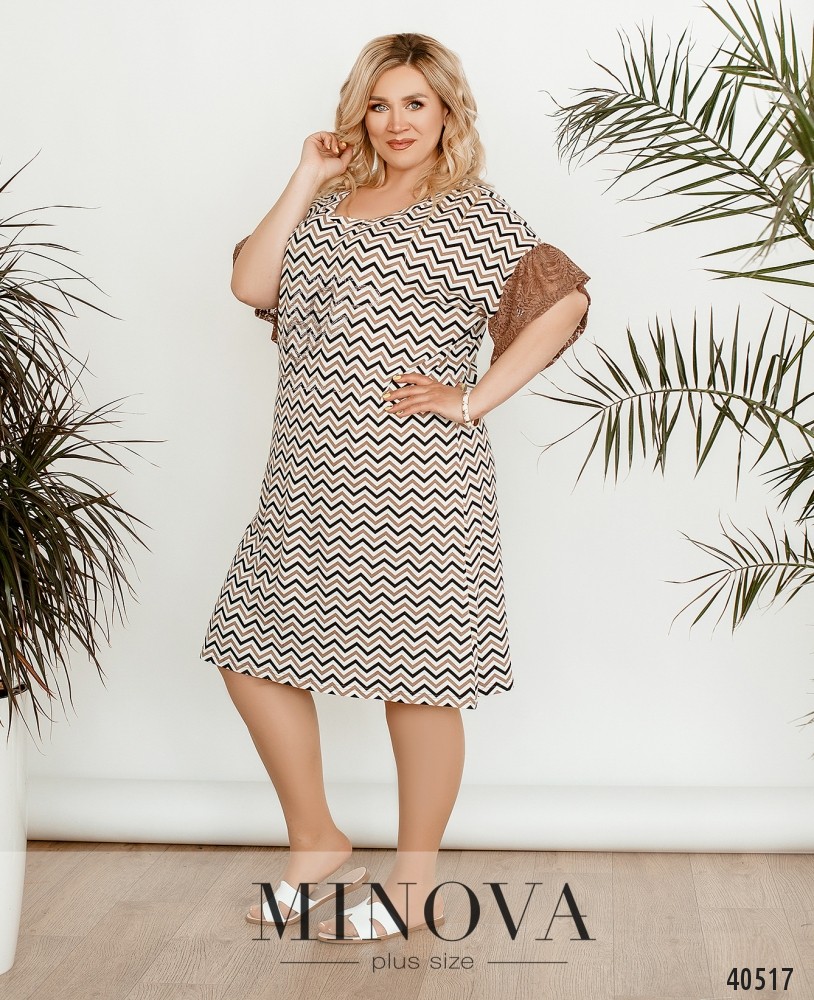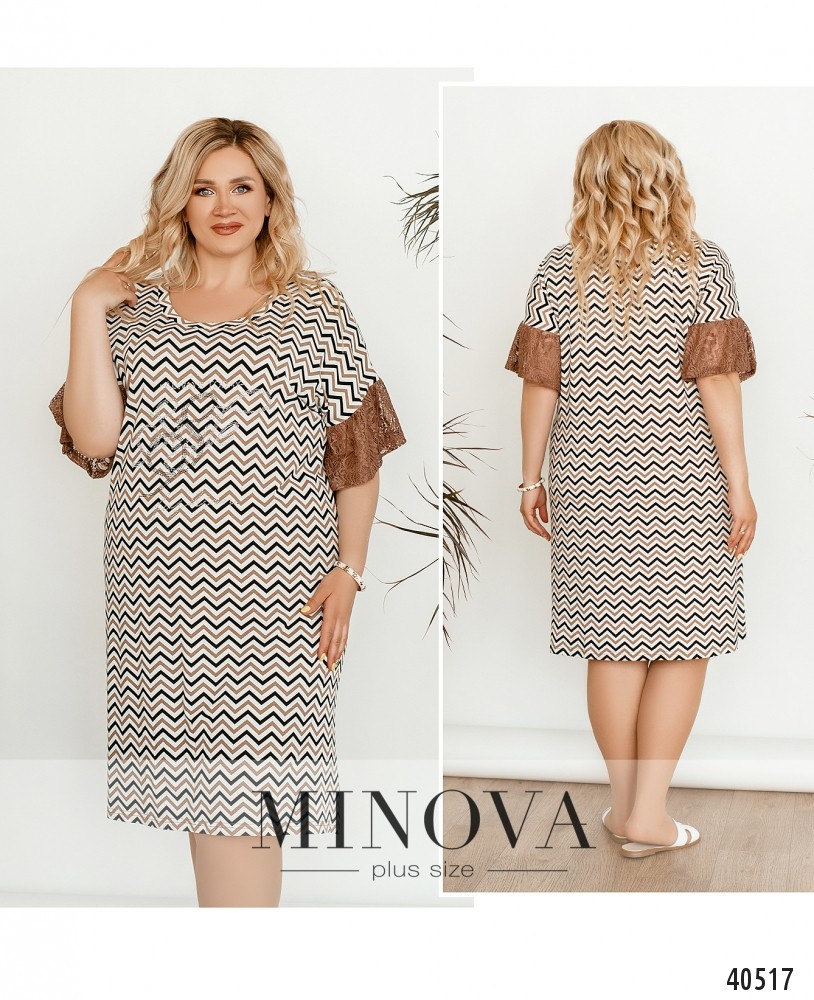 Оригинальное платье батал с узором, выложенным из страз, на груди. Рукава оторочены нежным кружевом. Вырез горловины широкий. Застёжек и карманов нет. Украшение входит в комплект.