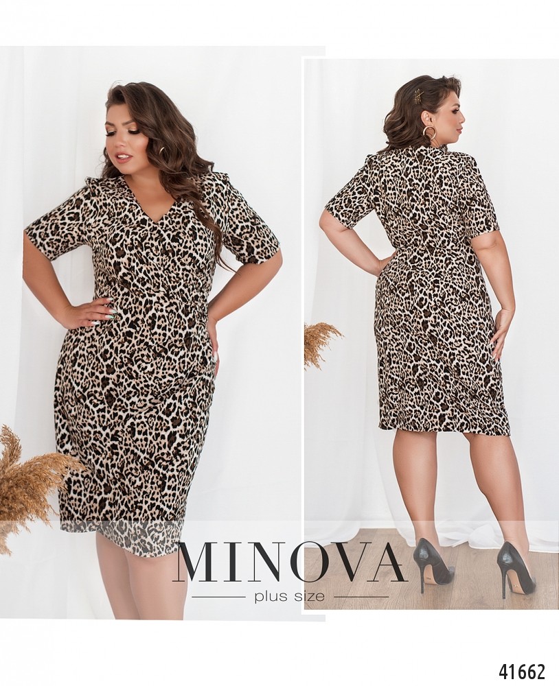Стильное платье батал с анималистичным принтом, вырез декольте на запАх, подшит слева, ткань присобрана оборками, изнутри также подшито. Платье без карманов, застёгивается на молнию, вшитую по спинке. Рукава без манжет.