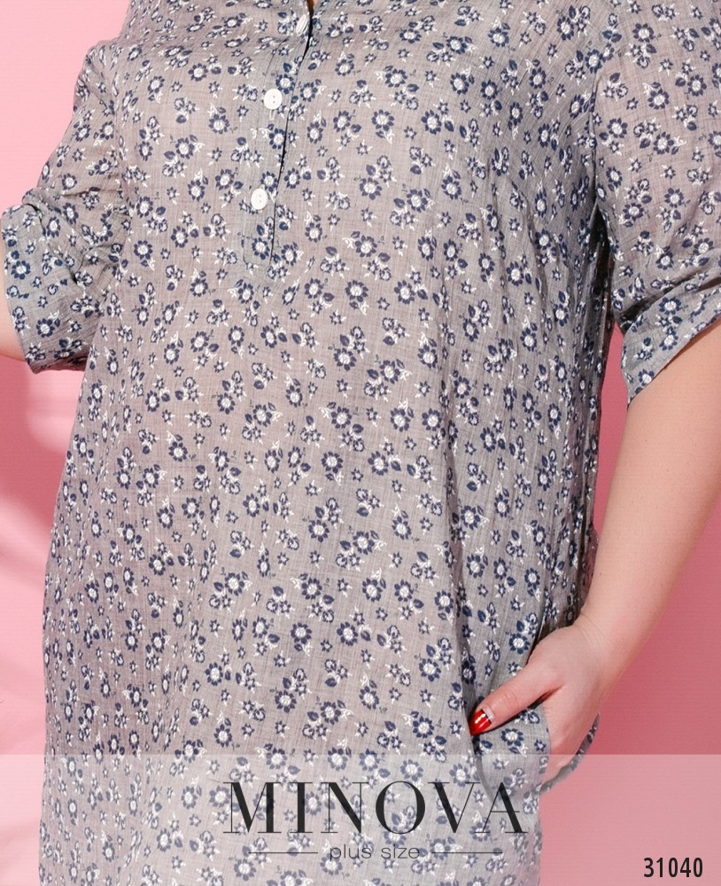 Свободное платье-рубашка в мелкий принт. Рукава собраны на планку с пуговицей. Горловина с вырезом оформлена планкой с пуговицами. Подол с карманами. Изделие без молнии.