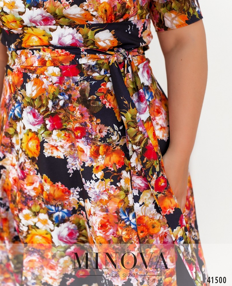 Платье-миди на запах с короткими рукавами и расклешенным подолом. На спинке платье запахивается внахлёст, а длинный пояс продевается через отверстие и завязывается в бант на лицевой стороне. Отрезной на спинке подол застегивается на скрытую молнию.