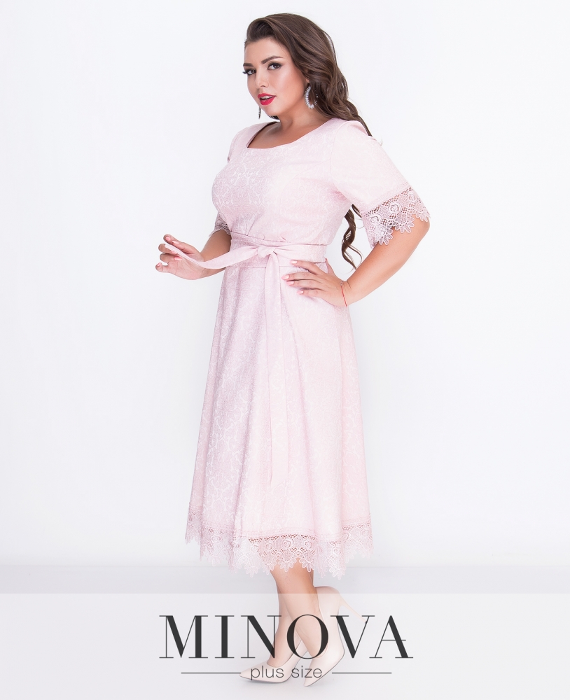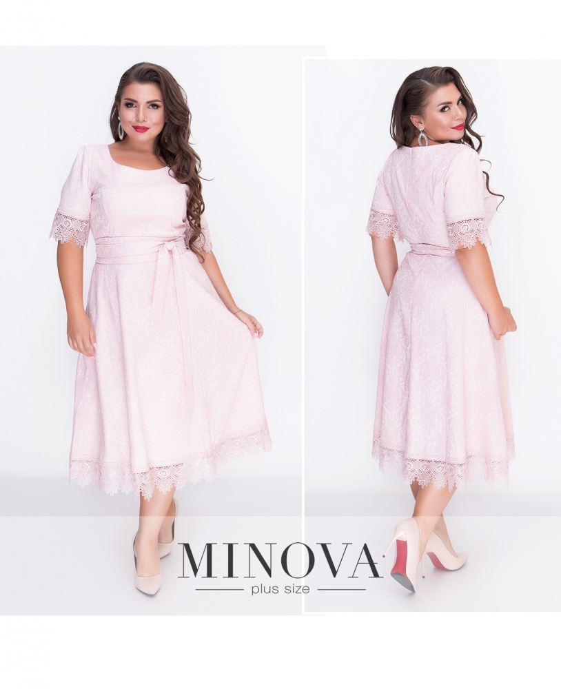 Жаккардовое приталенное платье с расклешенным отрезным подолом и съемным поясом. Платье с круглым вырезом и короткими рукавами с кружевной отделкой. Платье застегивается на скрытую молнию на спинке.