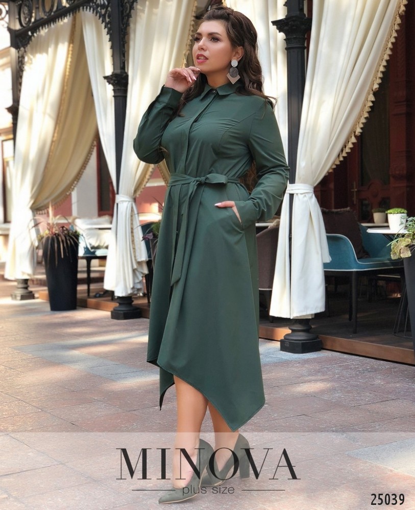 Романтичное платье с асимметричным подолом. Изделие застегивается на скрытые пуговицы по всей длине передней планке. Акцентированная талия с поясом, по бокам карманы. Воротник изделия рубашечного типа. Рукава полной длины с декорацией в виде пуговицы.