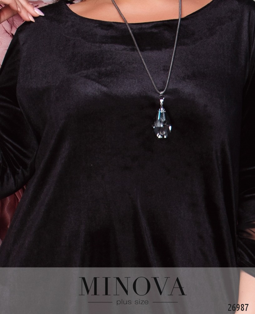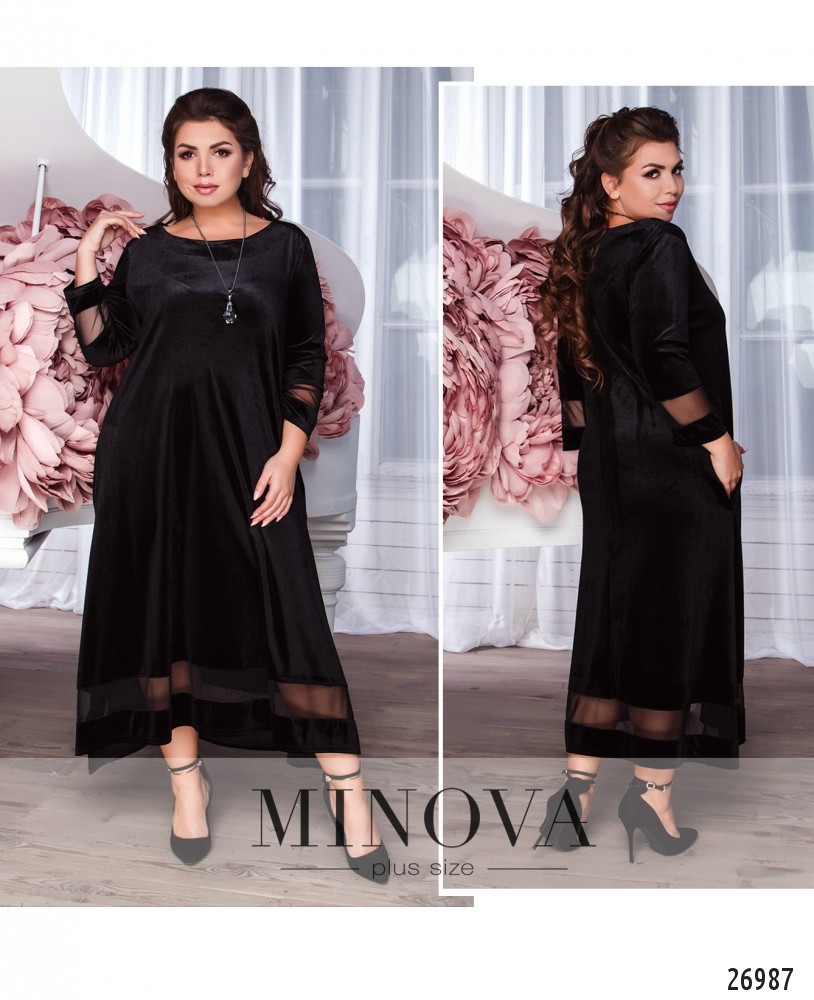 Бархатное вечернее платье А-силуэта с интригующими вставками из сетки на рукавах и асимметричном подоле. Полупрозрачная вставки на подоле визуально облегчают силуэт и приоткрывают ножки. На лицевой стороне подол укорочен и дополнен скрытыми карманами. В изделии отсутствует молния.