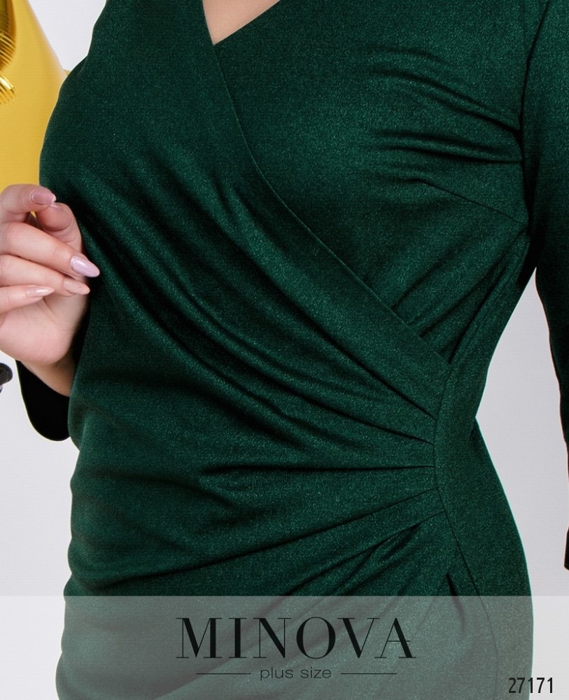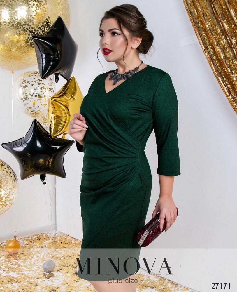Изящное платье по фигуре, подчеркивающие аппетитные изгибы. Платье с рукавами ¾ оформлено под запАх с драпировкой в зоне декольте и бедрах, что еще больше придает женственности фигуре. На спине скрытая молния и разрез по линии шага. Данная модель поможет создать лаконичный и женственный вечерний образ.