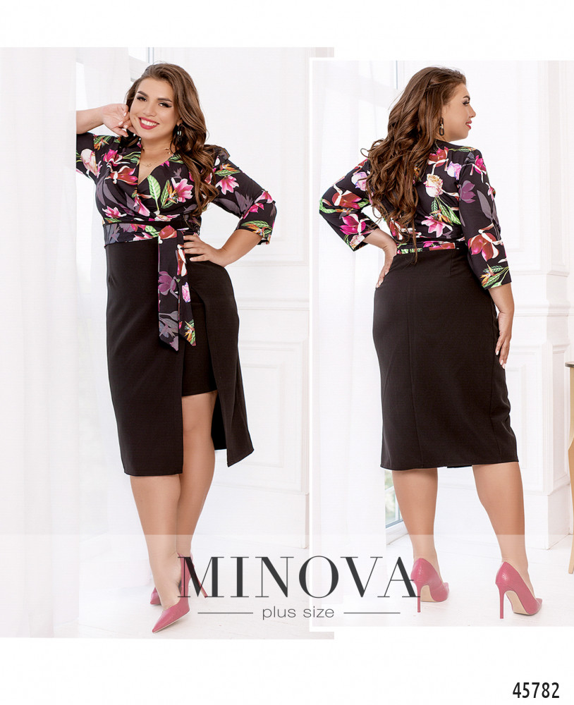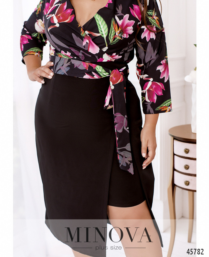 Женственное приталенное платье выполнено из двух видов тканей: однотонной и с контрастным принтом. Яркий лиф, подшитый на запах, с рукавами 3-4 дополнен необычным однотонным подолом, выполненным в виде двуслойной юбки с разрезом на верхнем слое. Текстильный пояс, делающий акцент на талии, пришит к платью по бокам