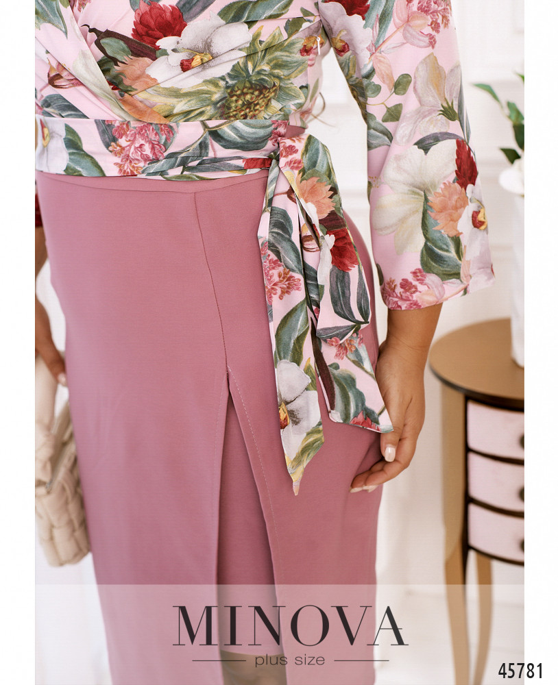Женственное приталенное платье выполнено из двух видов тканей: однотонной и с контрастным принтом. Яркий лиф, подшитый на запах, с рукавами 3-4 дополнен необычным однотонным подолом, выполненным в виде двуслойной юбки с разрезом на верхнем слое. Текстильный пояс, делающий акцент на талии, пришит к платью по бокам