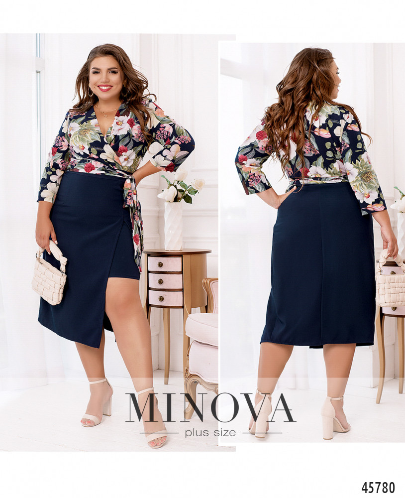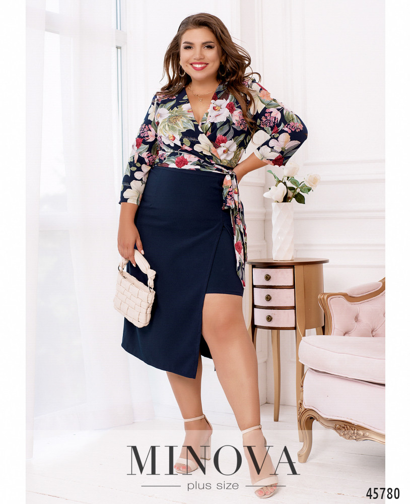 Женственное приталенное платье выполнено из двух видов тканей: однотонной и с контрастным принтом. Яркий лиф, подшитый на запах, с рукавами 3-4 дополнен необычным однотонным подолом, выполненным в виде двуслойной юбки с разрезом на верхнем слое. Текстильный пояс, делающий акцент на талии, пришит к платью по бокам