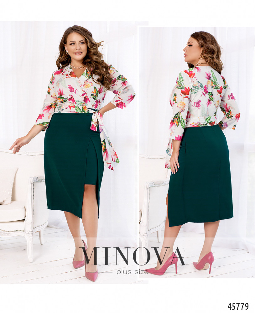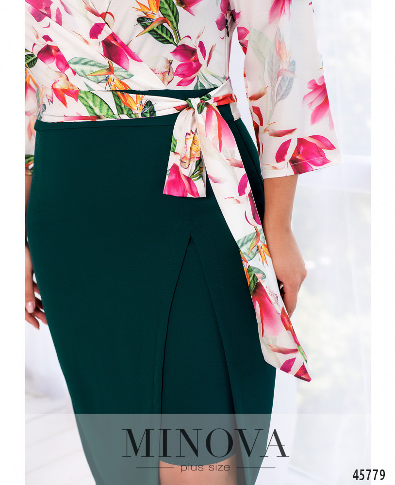 Женственное приталенное платье выполнено из двух видов тканей: однотонной и с контрастным принтом. Яркий лиф, подшитый на запах, с рукавами 3-4 дополнен необычным однотонным подолом, выполненным в виде двуслойной юбки с разрезом на верхнем слое. Текстильный пояс, делающий акцент на талии, пришит к платью по бокам
