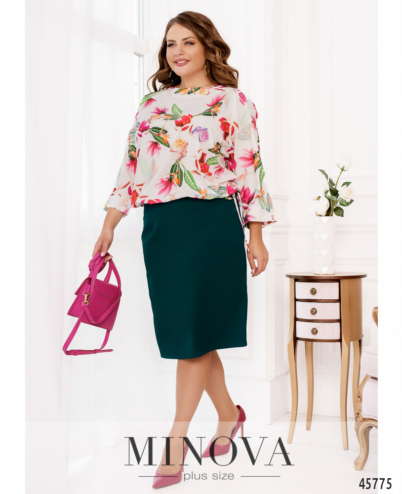 Изящное платье миди станет универсальным в вашем гардеробе, потому что в нем можно появиться как в офисе, так и на корпоративе или празднике. Яркий воздушный лиф свободного кроя с рукавами 3/4 с манжетами идеально дополнен лаконичным однотонным подолом