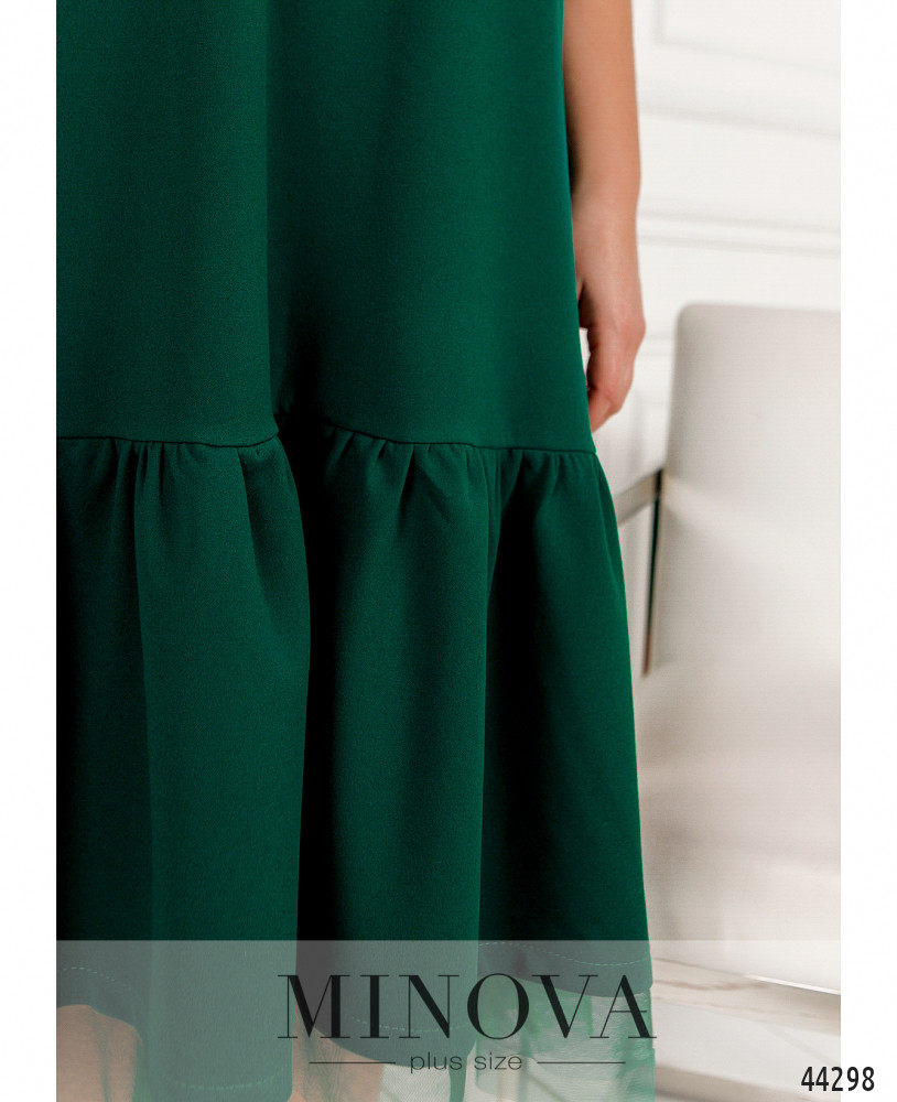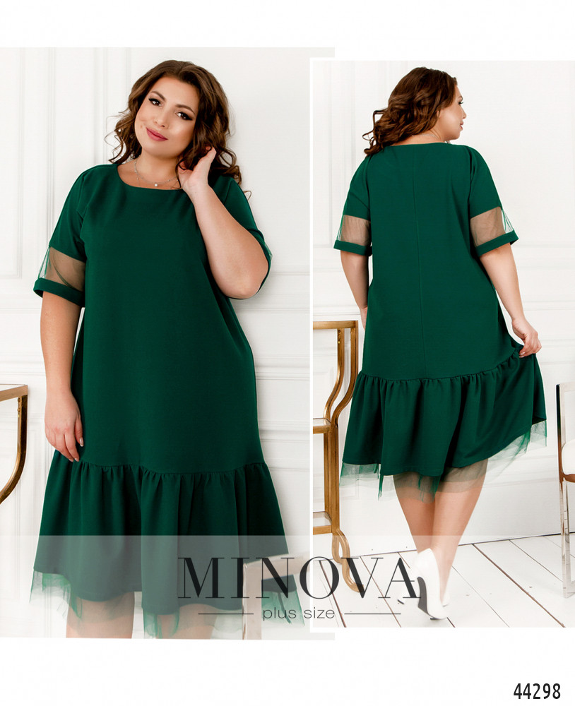 Нежное и женственное платье плюс сайз с вырезом горловины "лодочкой", рукава широкие, со вставкой полупрозрачной сеточки, снизу к оборкам на подоле подшита такая же сеточка. Карманов и застёжек нет.