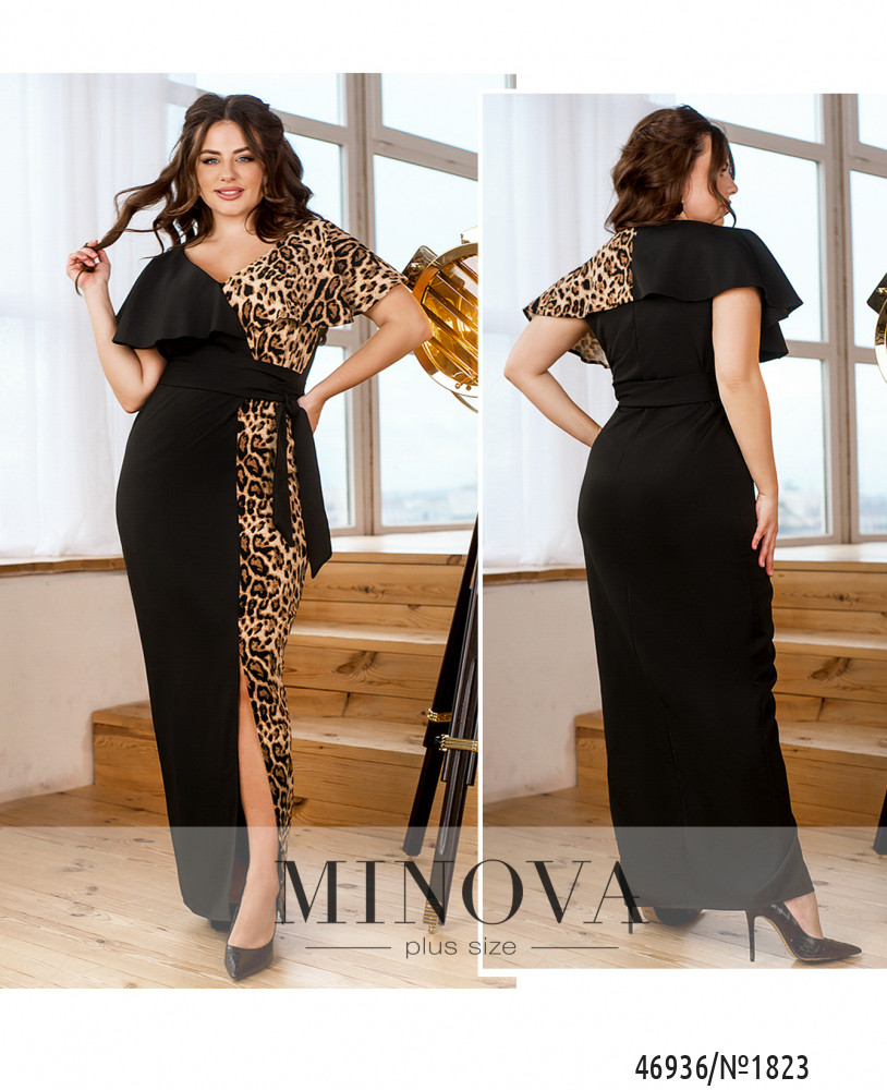 Длинное платье сразу добавляет фигуре изящества и несколько сантиметров роста визуально! Обрати внимание на новую модель платья батал в каталоге Minova. Платье из очень мягкой, слегка эластичной ткани, без карманов и застёжек. Визуально разделена на две части: левая, более узкая, украшена анималистичным контрастным принтом, переходящим на рукав. Правая – однотонная. Рукава ниспадают мягкими оборками, не длинные, прикрывают плечи и сходятся на спине. На спинке также видно разделение по цвету – только на рукавах. Вырез горловины V-образный, не очень глубокий, застёжек и карманов нет. Ещё одна изюминка наряда – подшитый пояс на уровне высокой талии, который можно завязать бантом сбоку. На подоле слева – довольно длинный разрез. Платье будет прекрасно смотреться на любой фигуре.