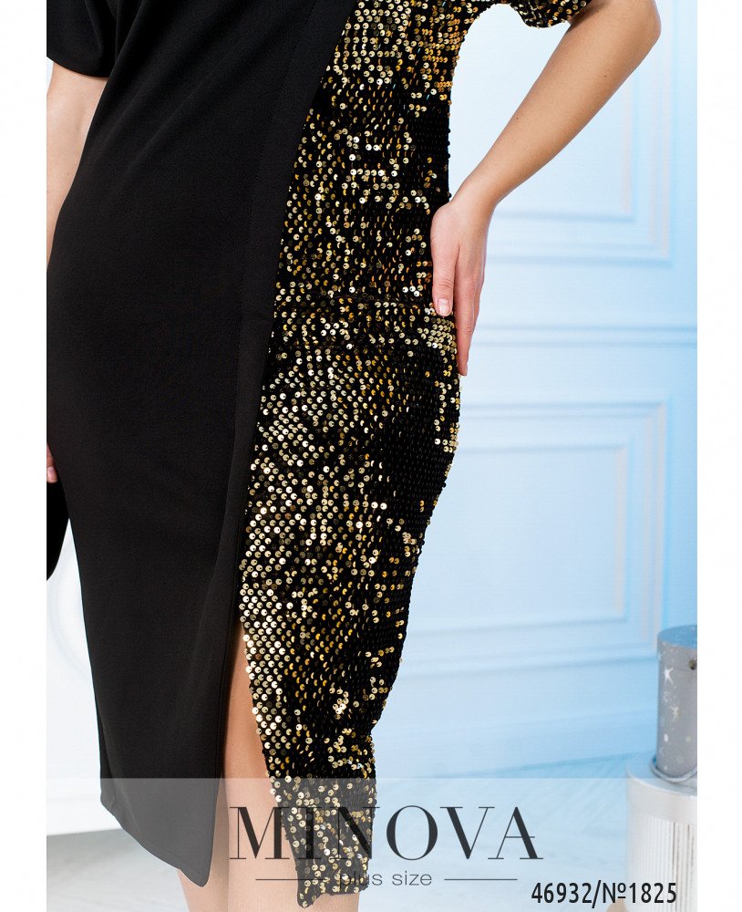 Стильно, умеренно и очень нарядно – если вы обладаете отменным чувством вкуса, непременно обратите внимание на модель платья батал из нового каталога Minova. Платье приталенное, без карманов и застёжек. Визуально поделена на две части: правая, более широкая часть, однотонная и гладкая, а левая украшена блестящими пайетками, можно выбрать яркий или более сдержанный вариант. Спинка полностью гладкая. Вырез горловины широкий, полукруглый. Спереди на подоле небольшой разрез между блестящей и матовой сторонами. Длина миди, так что рекомендуем обувь на каблуке или платформе.