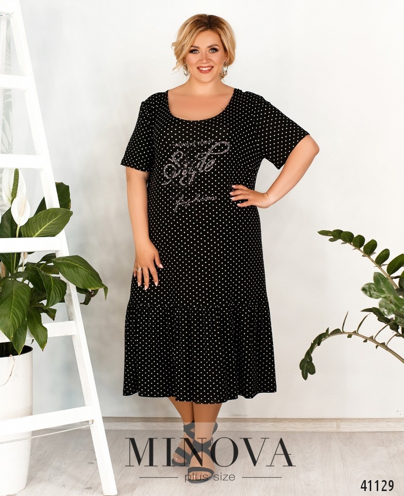 Мягкое и удобное повседневное платье батал в горошек, украшено узором из страз на груди, вырез горловины глубокий, полукруглый. Застёжек и карманов нет, рукава без манжет, подол украшен мягкими длинными оборками.
